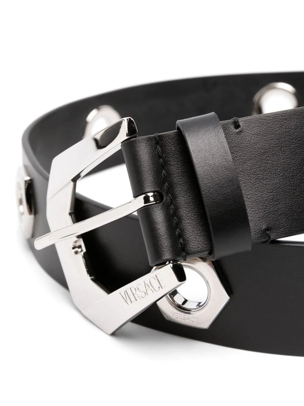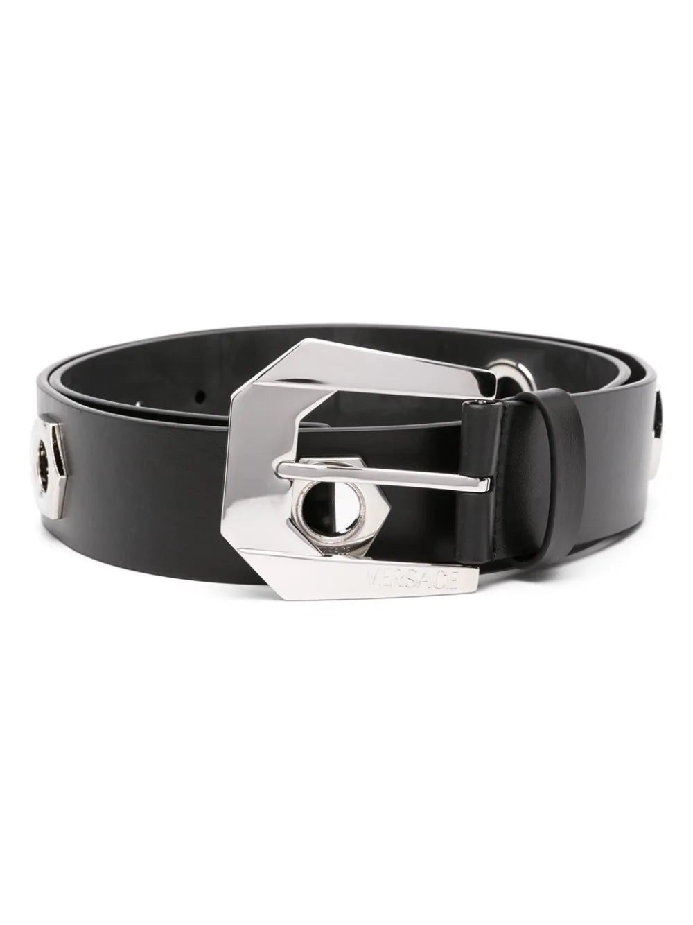 Crafted from smooth leather to a sleek silhouette, this black Versace belt is punctuated by sharp, angular silver-tone hardware in the form of a Medusa Heritage buckle and stud inserts resembling nuts and bolts.