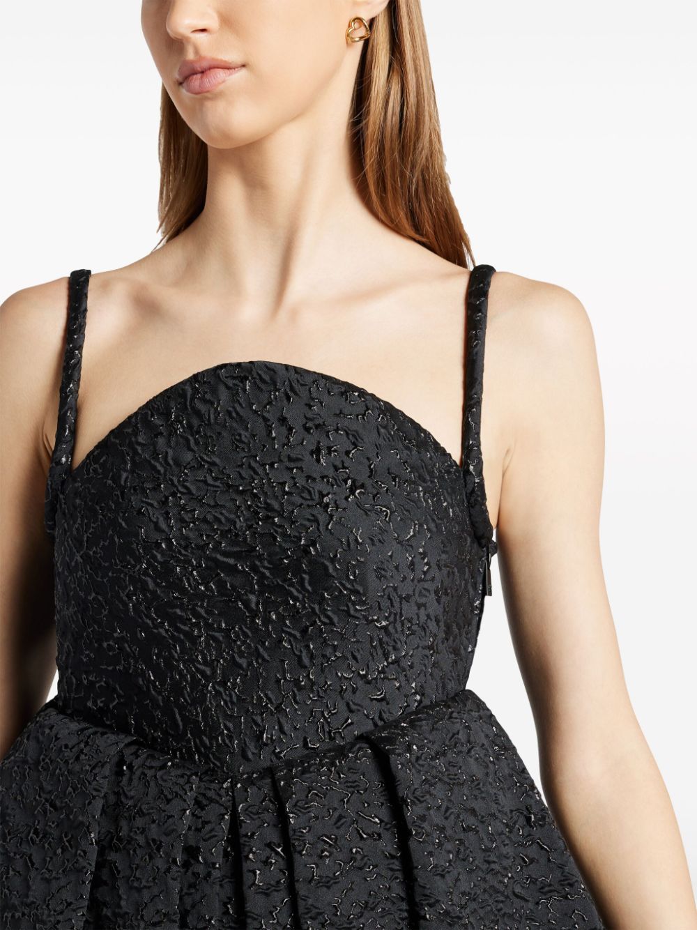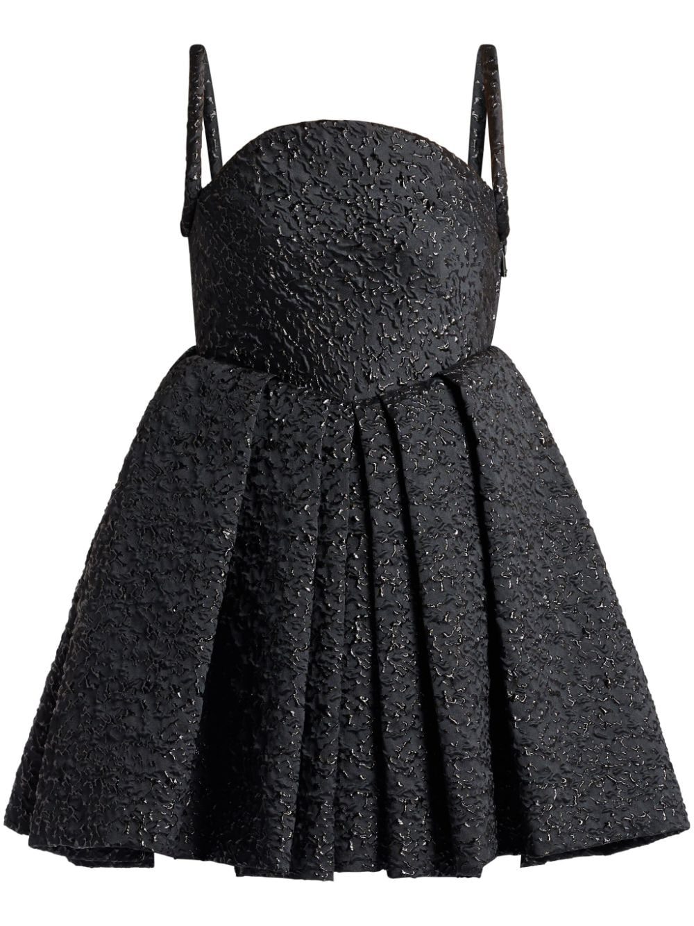 This black Versace dress is inspired by both ‘the energy of city living’ and Donatella’s 1995 collection made in collaboration with her brother. It’s crafted from twill cloqué woven with Lurex threads that create liquid-like ripples from the concave neckline of the boned bodice to the hem of the pleated skirt.