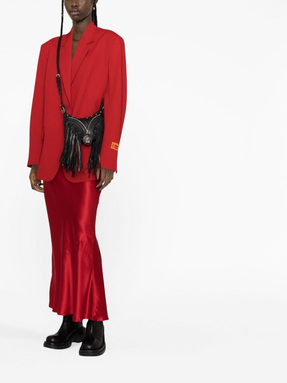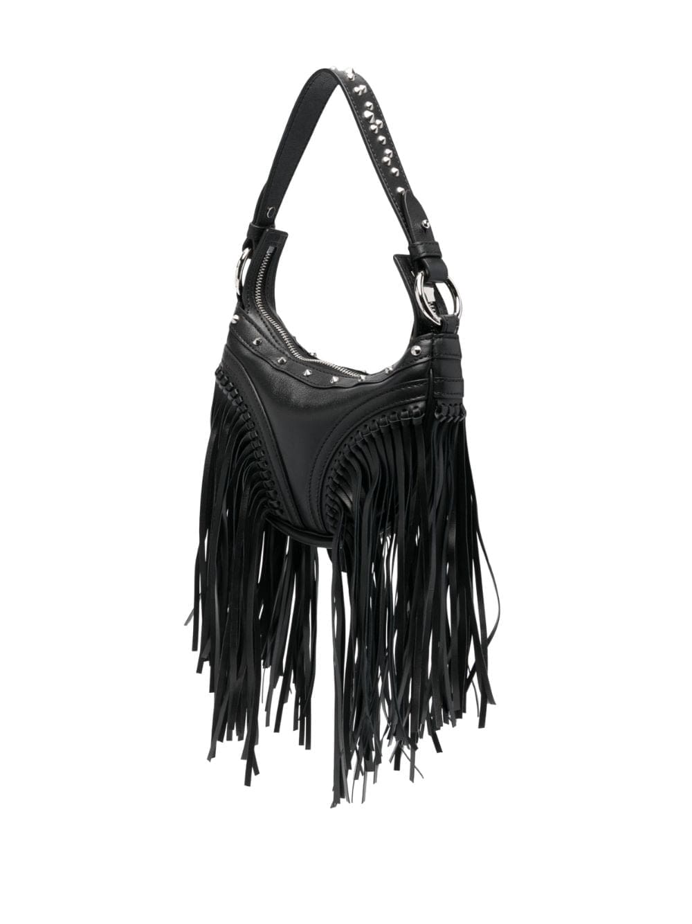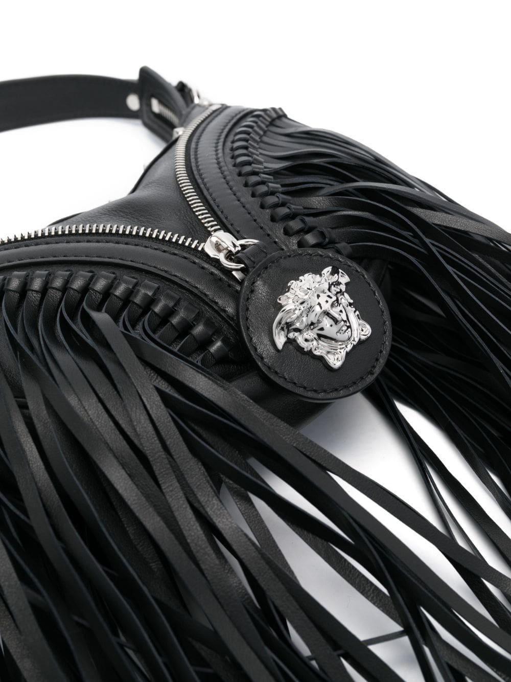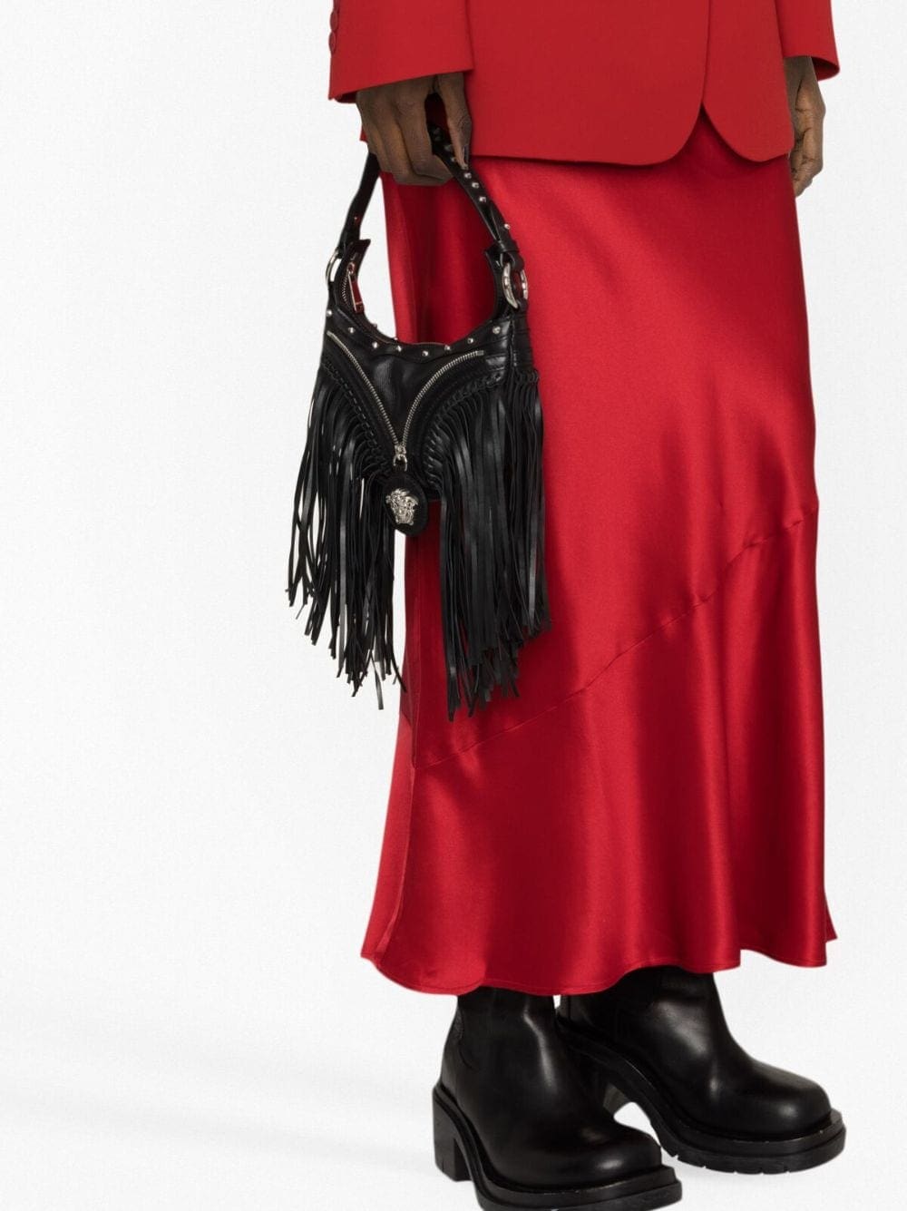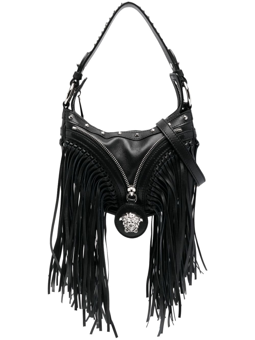 Versace takes inspiration from biker styles to create the Repeat shoulder bag. It's crafted from black calf leather with silver-tone hardware and hand-knotted, elongated fringing. The iconic Medusa Head plaque sits front and centre on the medallion charm at the front.