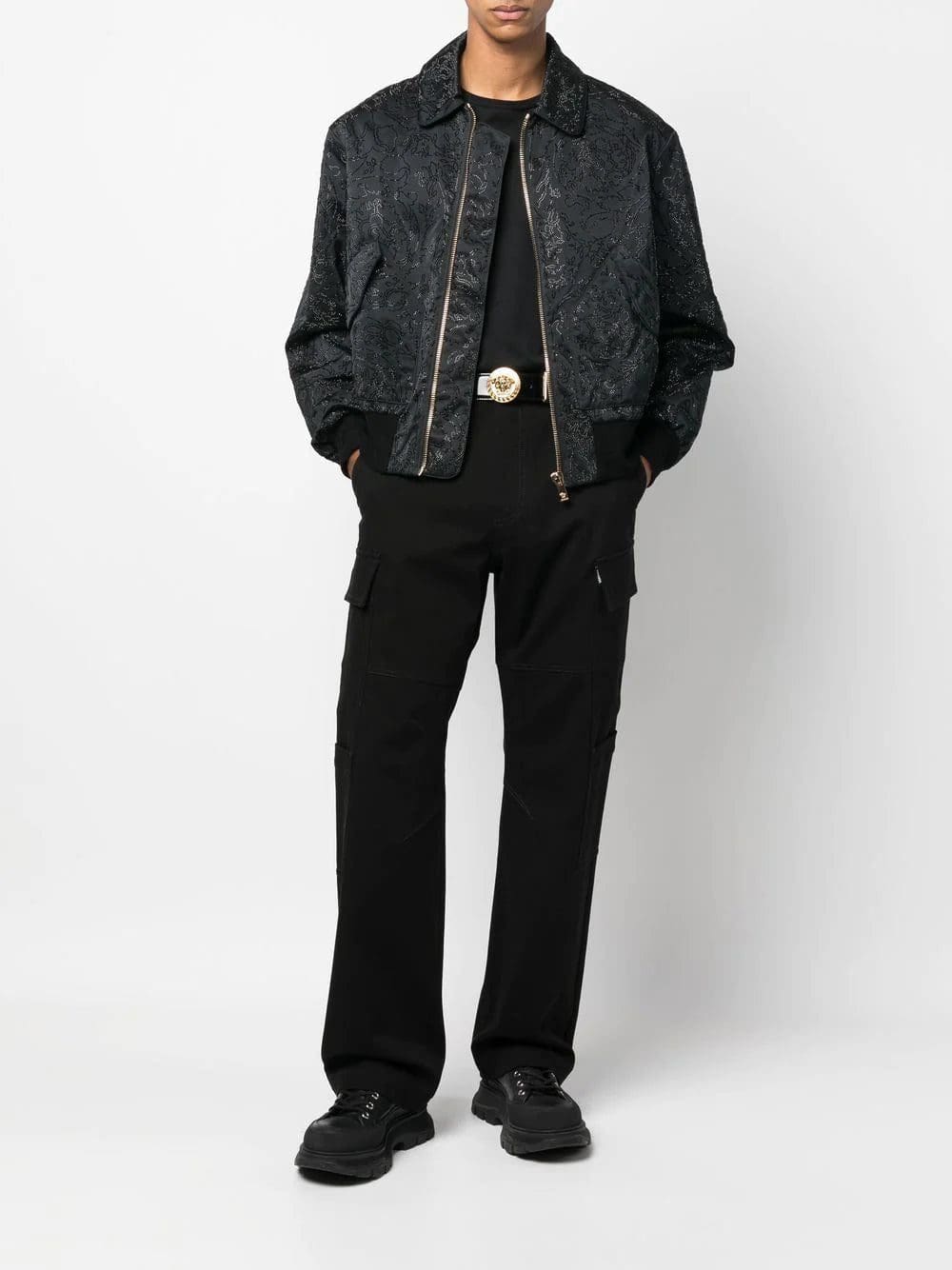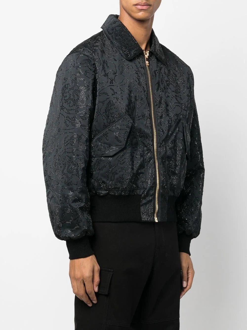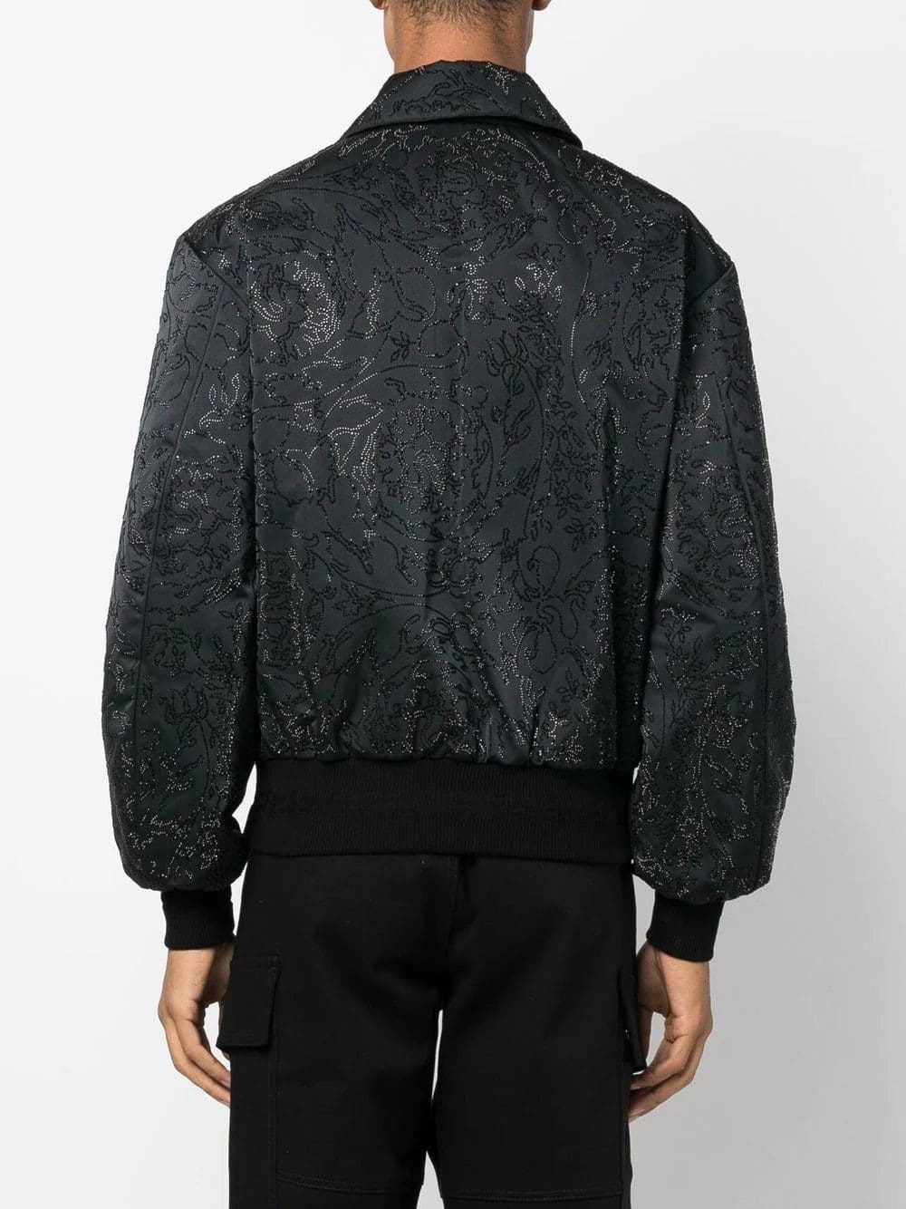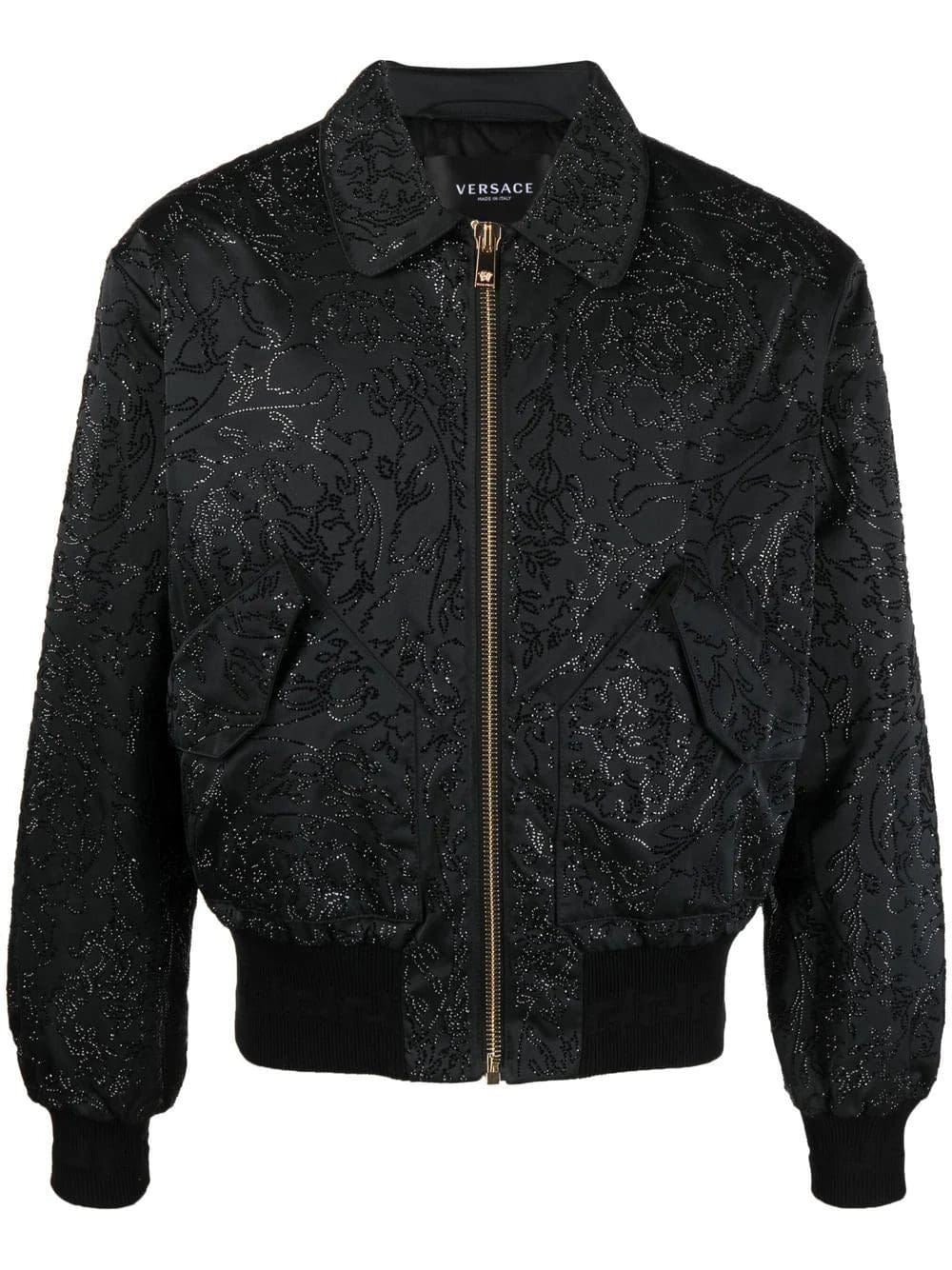 rhinestone-baroque bomber jacket from Versace featuring black, cotton, satin finish, rhinestone embellishment, baroque-pattern print, classic collar, front zip fastening, two side flap pockets, ribbed cuffs, ribbed hem, long sleeves and straight hem.