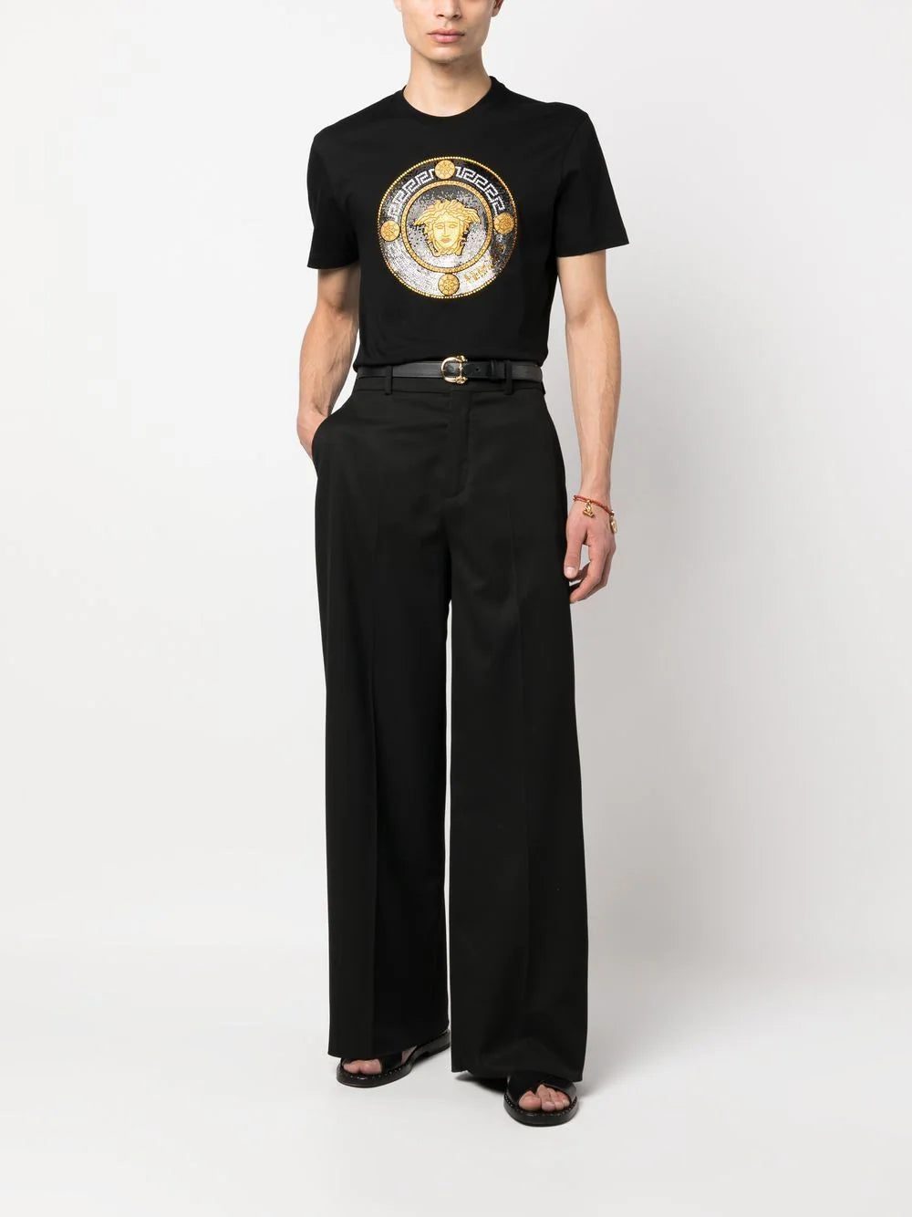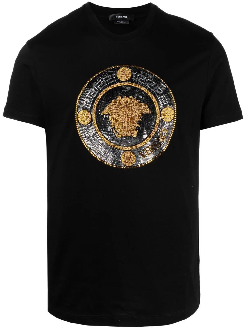 black cotton crystal embellishment Medusa Head motif round neck short sleeves straight hem