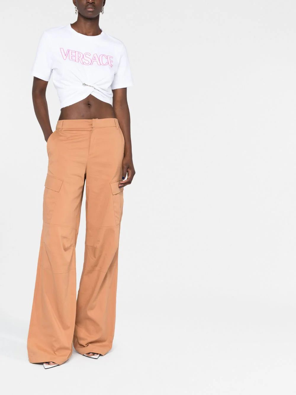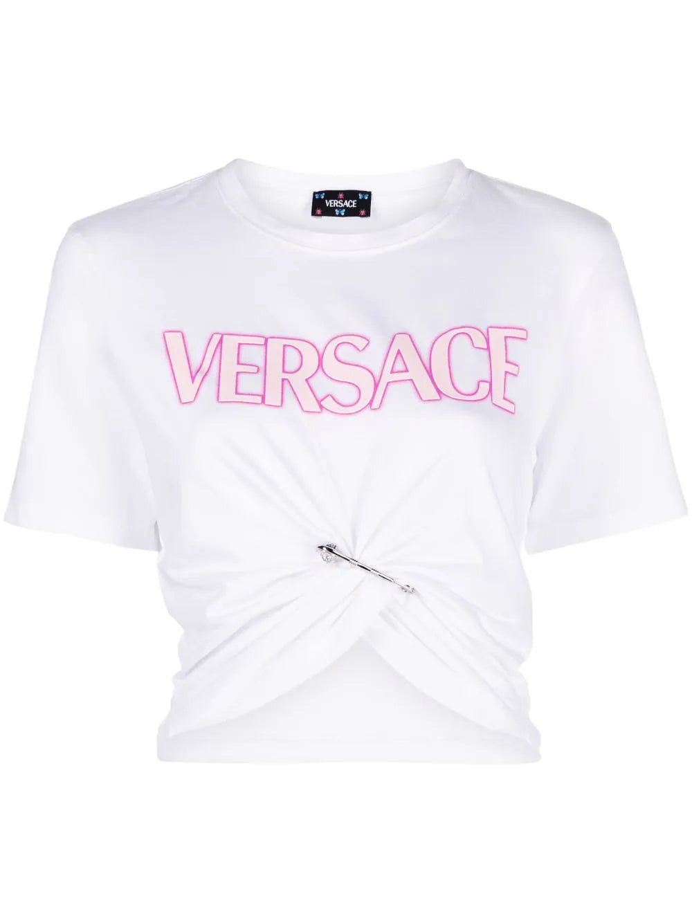 Versace takes a turn on basic cotton T-shirts with this design, modernly cropped and twisted with a safety pin. The beautiful logo-engraved detail and the hot pink logo print give this piece a bold feminine vibe.