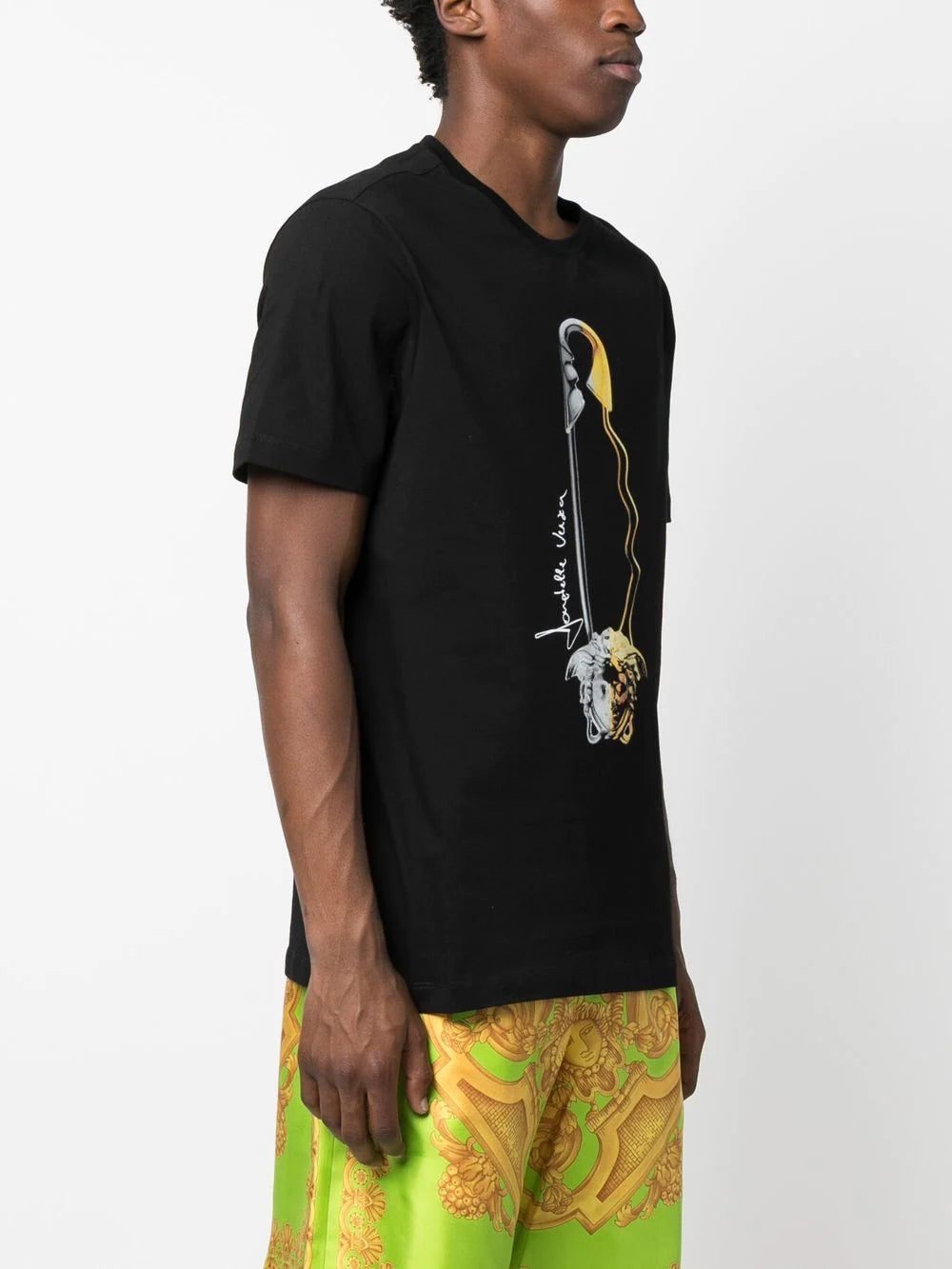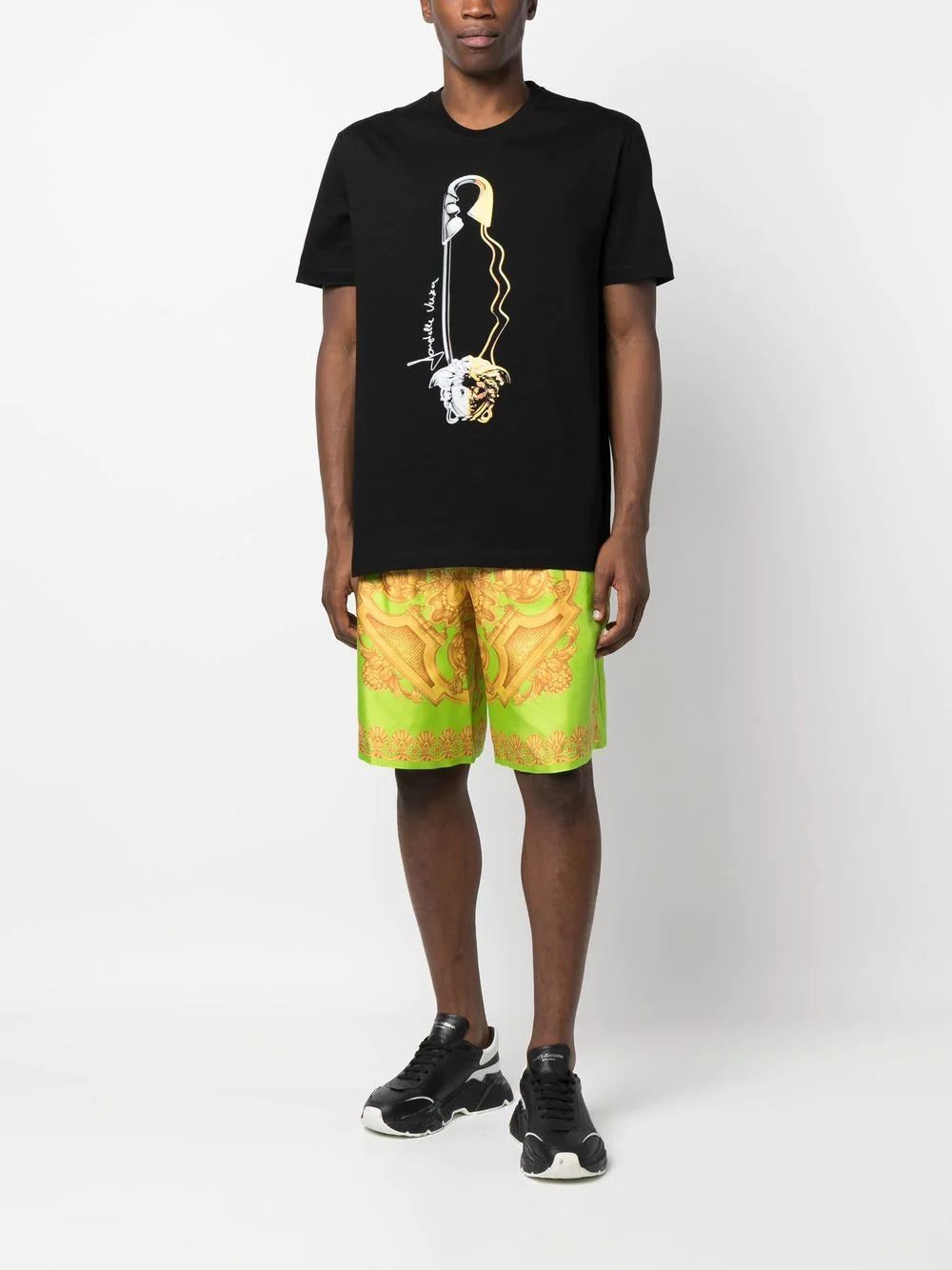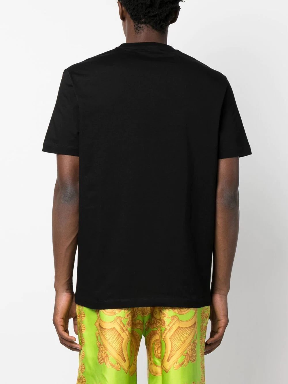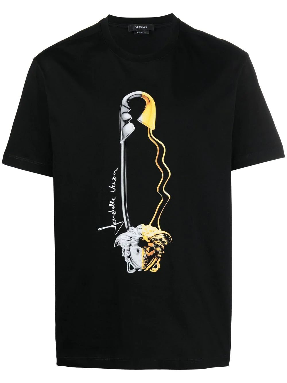 Versace incorporates iconic motifs of the label into this T-shirt. Crafted from cotton, the crew-neck silhouette depicts a Medusa-embellished pin.