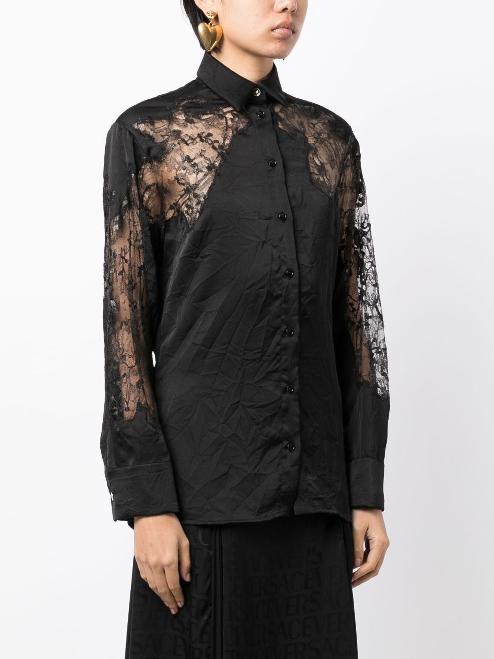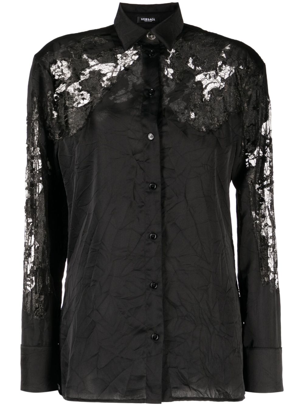 Imagined in black, this satin shirt by Versace is defined by a subtle crinkle effect that brings texture to the silhouette. Cut to a slim fit, it recalls the brand's sophistication with tonal lace panels across the shoulders and sleeves.