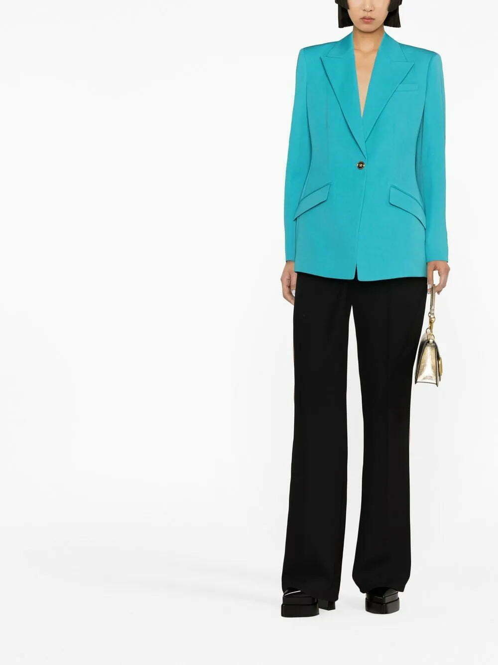 Versace presents a classic single-breasted silhouette with this blue-hued blazer. This piece is fastened with a single gold-tone button that plays host to the Medusa Head motif, one of the brand's most celebrated signifiers.