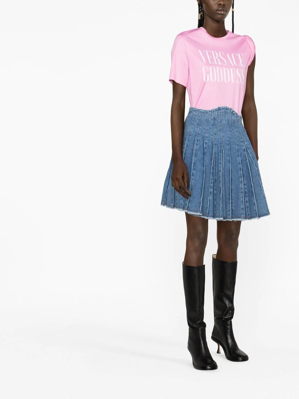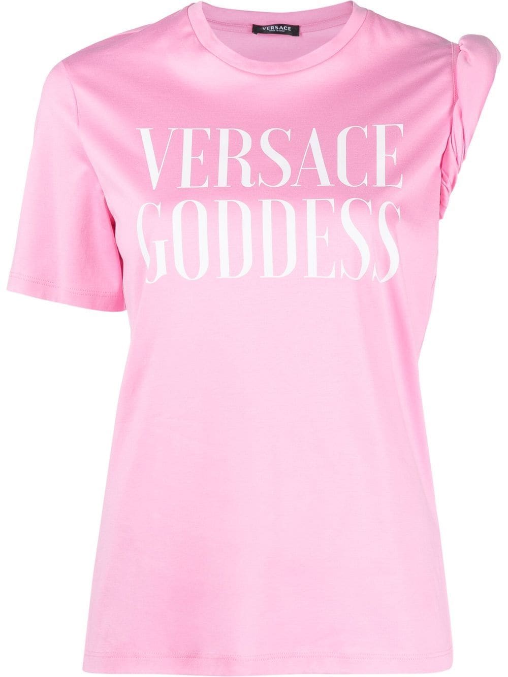 Versace takes inspiration from ancient Grecian imagery in this cotton T-shirt design, evident in the 'goddess' slogan print at the chest and in this twisted sleeve detail.
