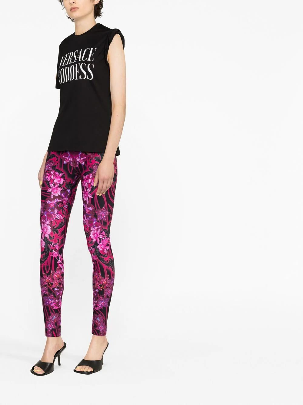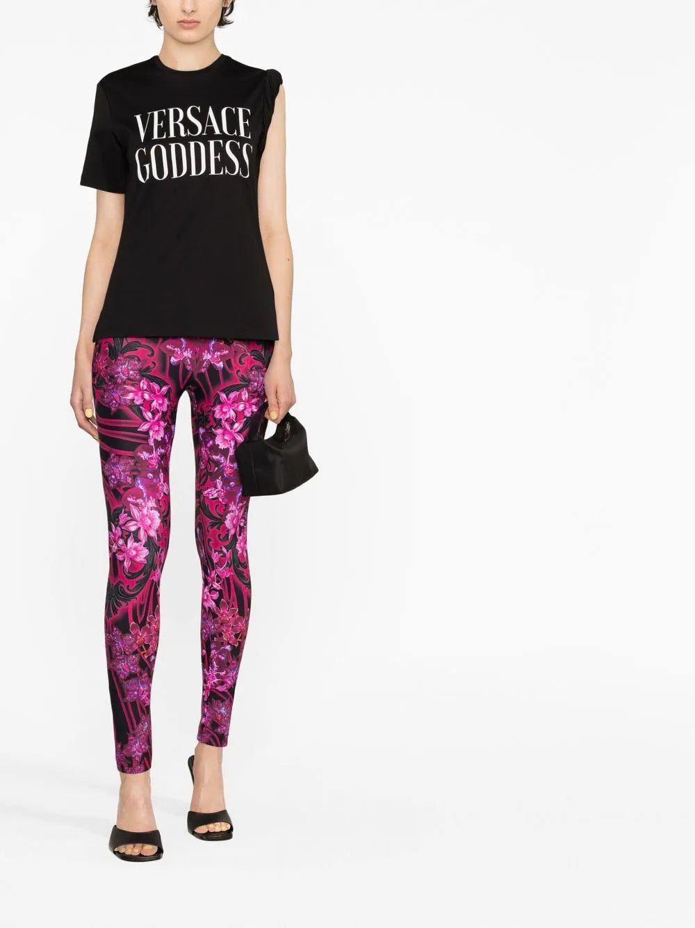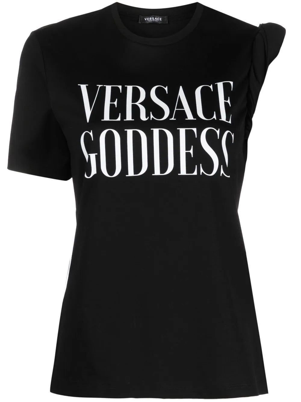 Versace takes inspiration from ancient Grecian imagery in this cotton T-shirt design, evident in the 'goddess' slogan print at the chest and in this twisted sleeve detail.