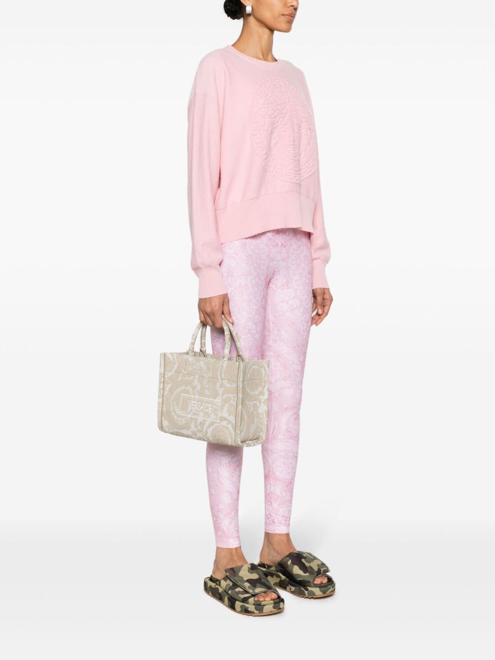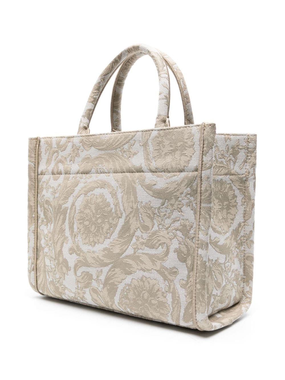 Versace’s beige Barocco Athena tote bag is a fusion of house codes – from the swirling floral jacquard to the ‘90s logo embroidery at the front. It’s crafted from durable canvas with rolled edges for structure.