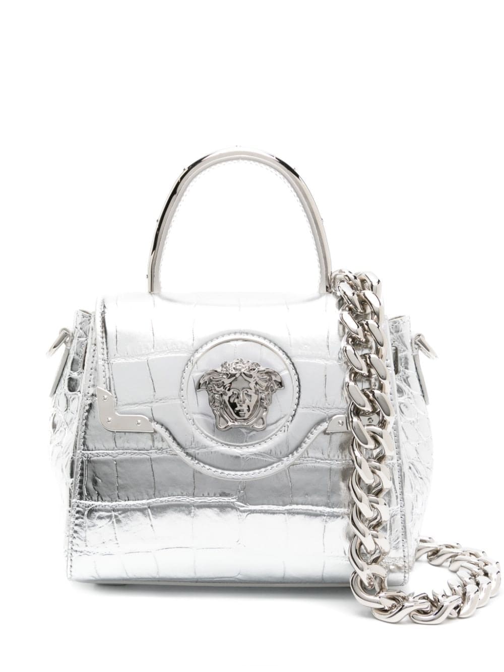 Versace’s small La Medusa bag is crafted from metallic silver croc-embossed leather with the namesake Gorgon head at the front – the heritage emblem was originally inspired by a discovery found among local Roman ruins where Gianni and Donatella Versace used to play as children. Two interchangeable shoulder straps and expandable sides reinforce its versatility.