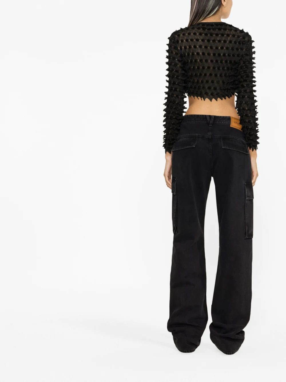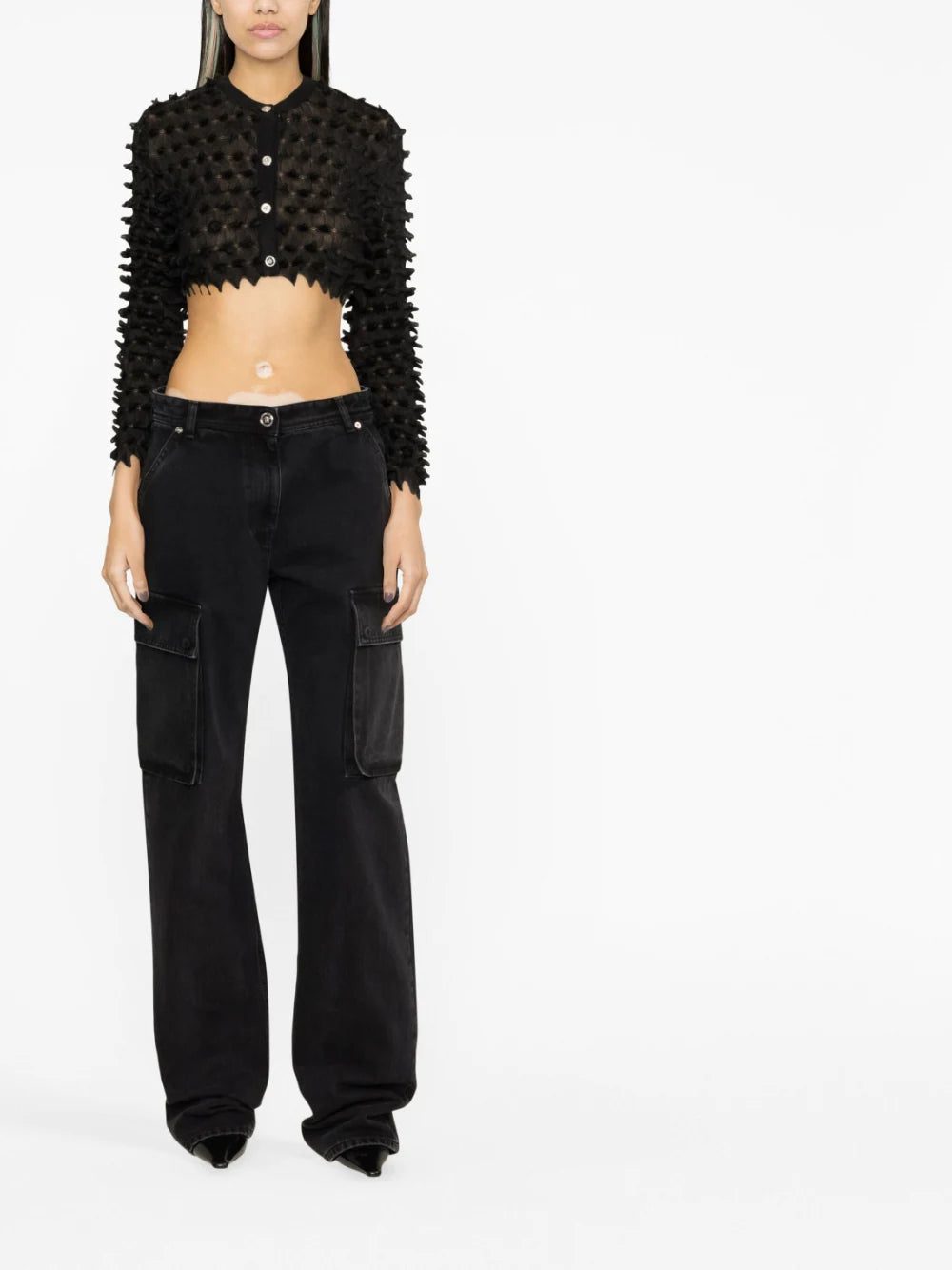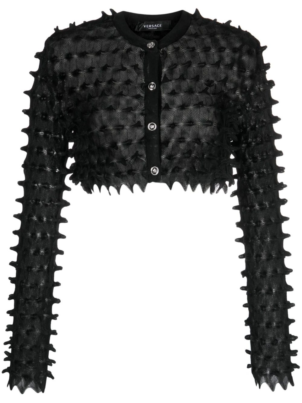 Defined by a three-dimensional spiked texture, this cropped cardigan by Versace channels an avant-garde approach and is adorned with silver-tone buttons, embossed with the brand's iconic medusa logo.