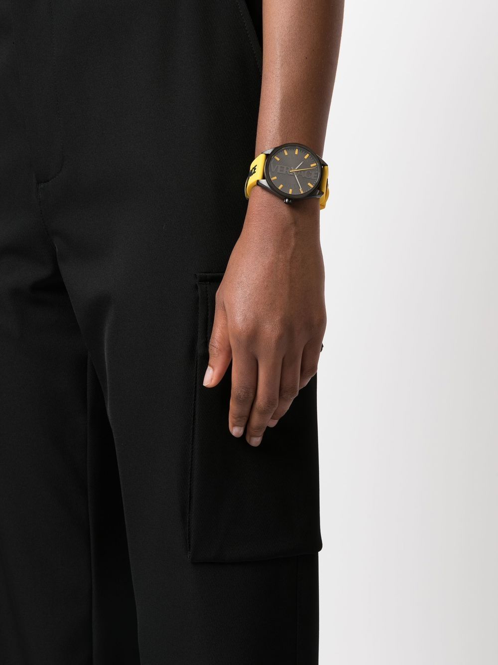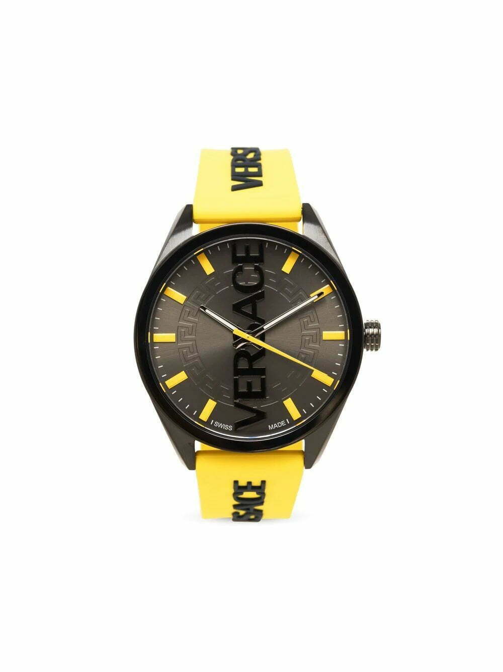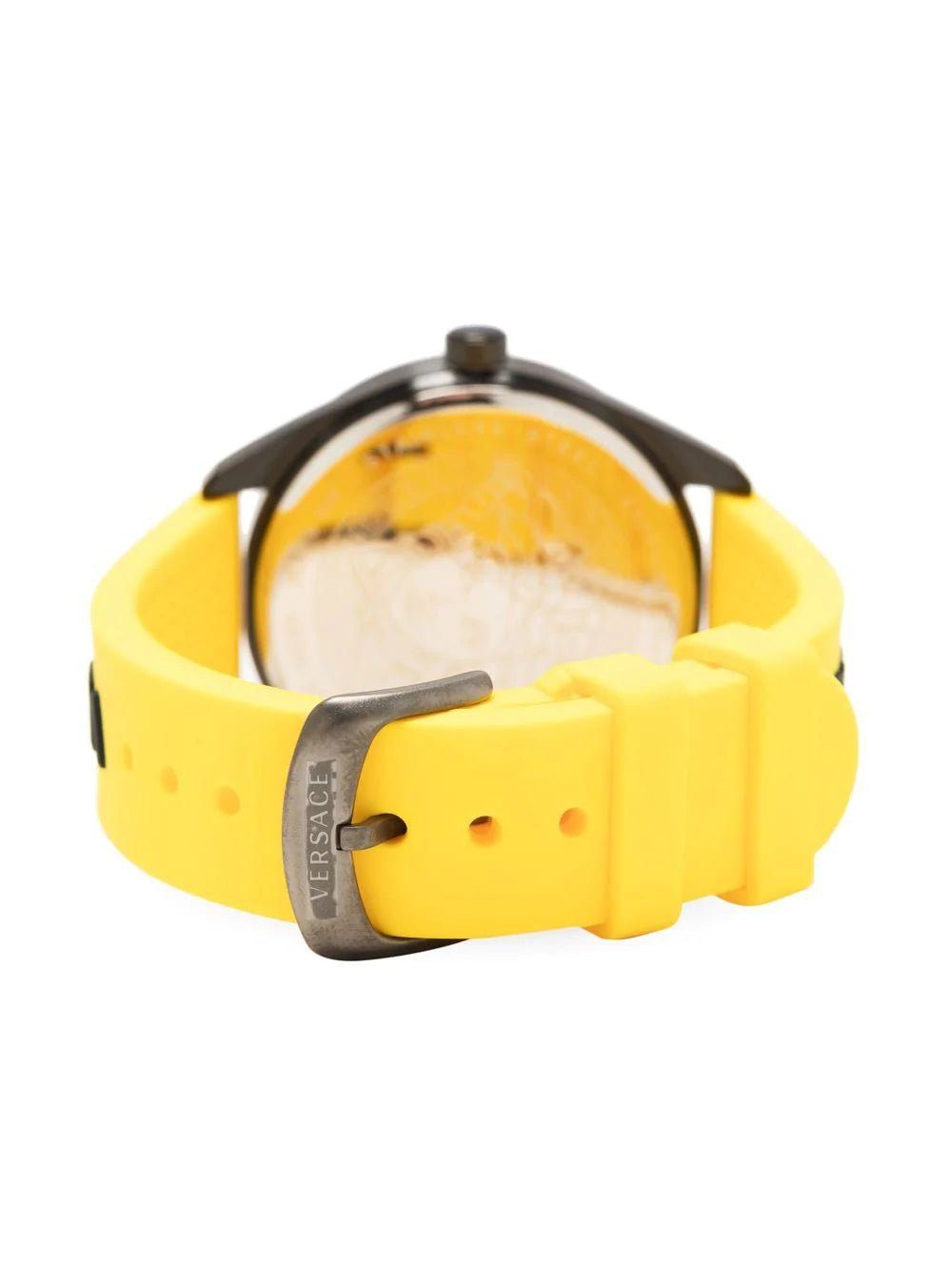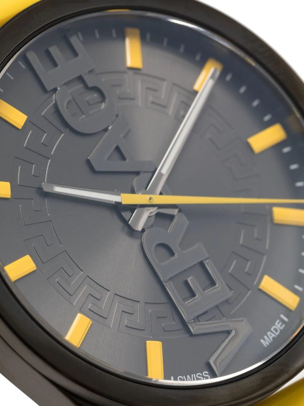 Mounted in a 40mm stainless steel case, the V-Vertical timepiece pays homage to Versace's penchant for logomania. Forming the shape that names the piece, the label's lettering is found on the dial while the yellow-hued strap continues the branded aesthetic.