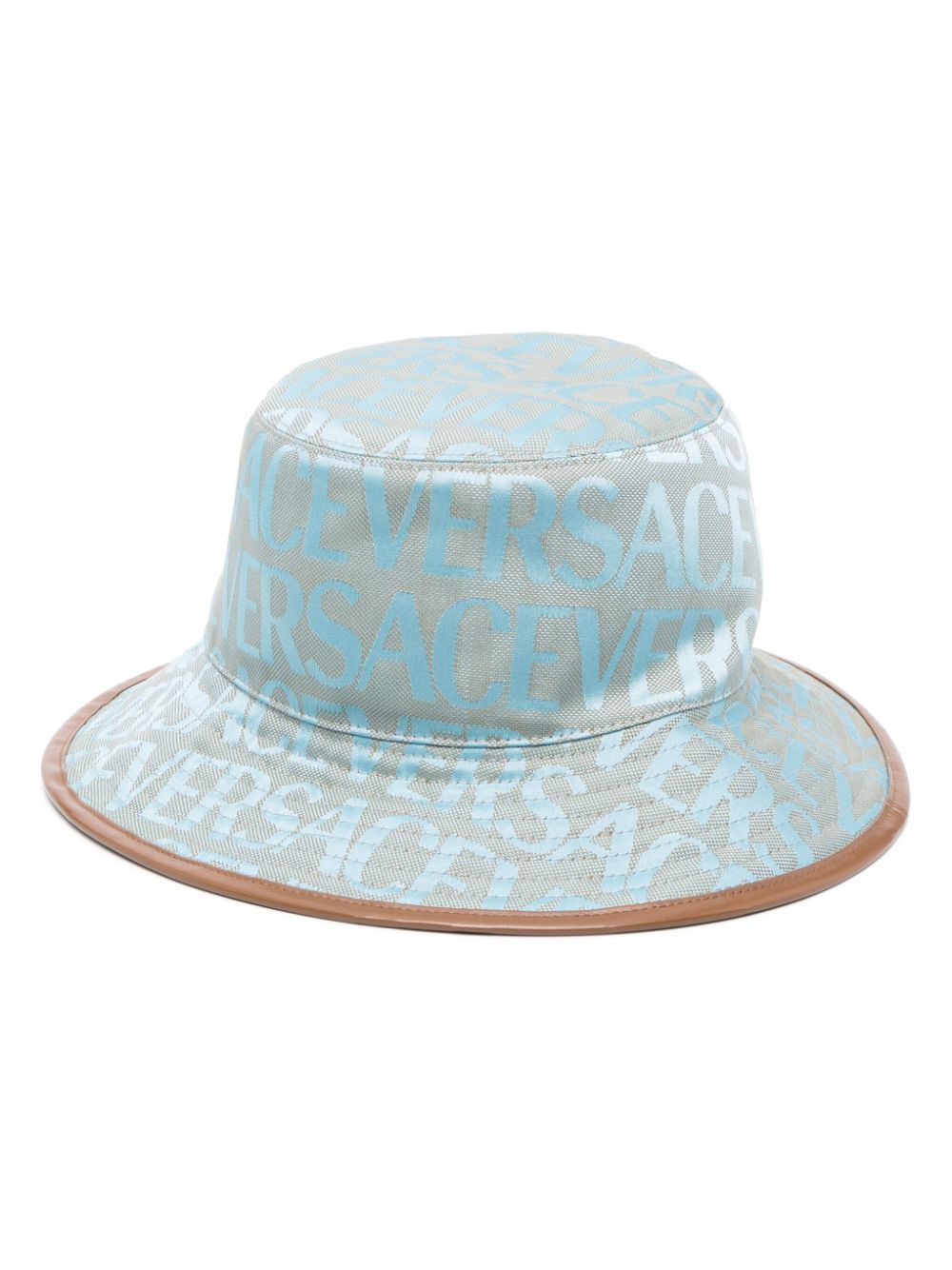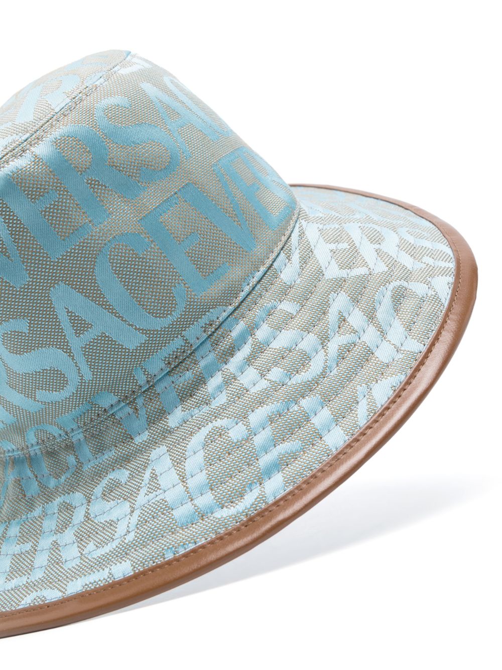 This light-blue bucket hat spotlights Versace's Allover motif: a pattern comprising repeating logo lettering. It boasts a wide dropped-brim and is enhanced with calf leather trims for a sophisticated finish.