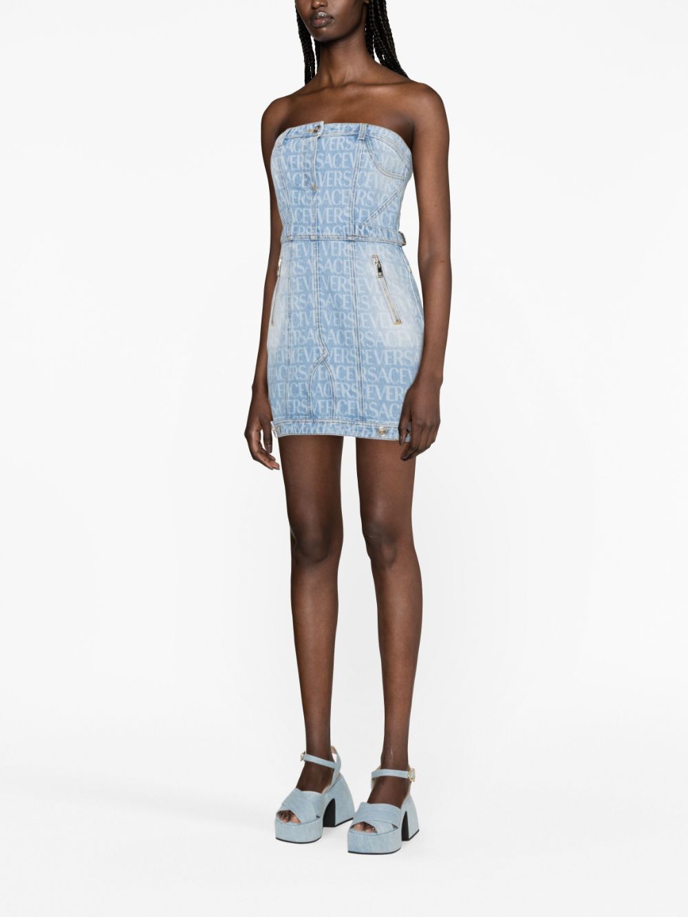 Versace's Allover pattern, a graphic comprising repeating logos, takes centre stage on this panelled minidress. Borrowing design details associated with jeans, it features a waistband-inspired neckline – complete with a Medusa Head button – arcuate pockets and a leather logo patch at the back.
