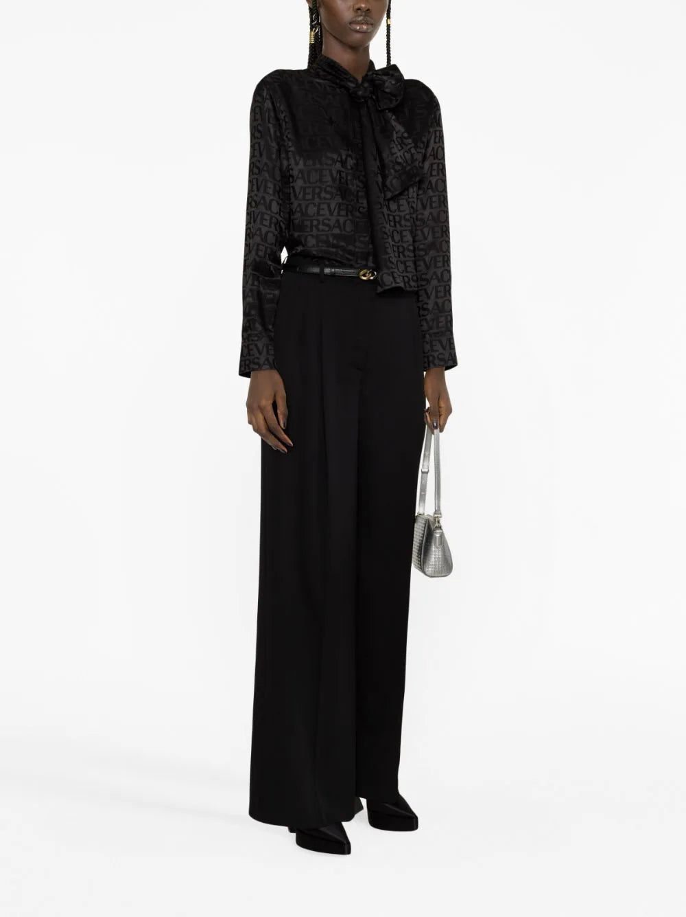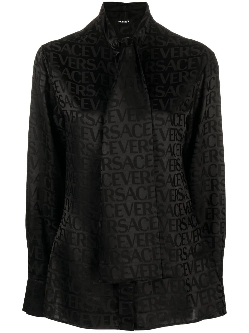 Made in Italy from lustrous satin, this black Versace blouse is defined by its fluid silhouette, detailed with a scarf-tie collar, and its Versace Allover jacquard motif, which offers a maximalist branding touch.