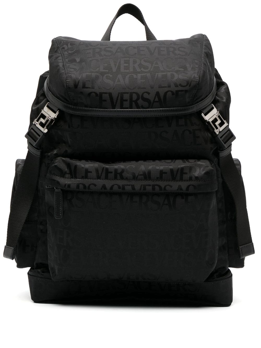 Infused with house motifs, Versace presents this backpack in a sleek black colourway. The functional design plays host to a tonal Versace Allover print and boasts silver-tone buckle fastenings which take the shape of the iconic Greca motif.