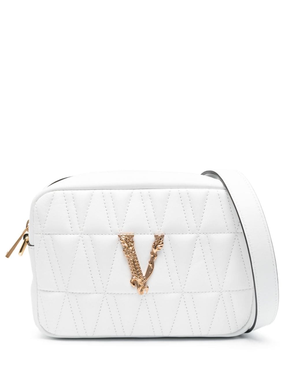 Versace’s shoulder bag is the newest addition to the enduring Virtus line. It’s crafted from white quilted leather to a compact silhouette and punctuated with a central gold-tone V plaque surrounded by acanthus leaves borrowed from the brand’s signature Barocco motif.