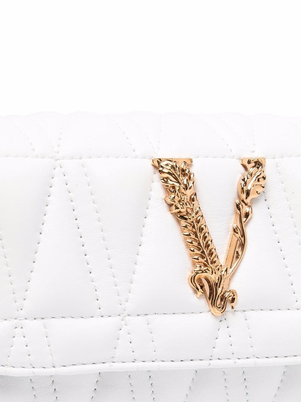 Adding to the signature 'Virtus' line, the Italian fashion house presents this white mini bag. Quilted in a V-pattern, this accessory is punctuated by the central gold-tone metal Barocco letter V, embellished by acanthus leaves taken from Versace’s signature motif.