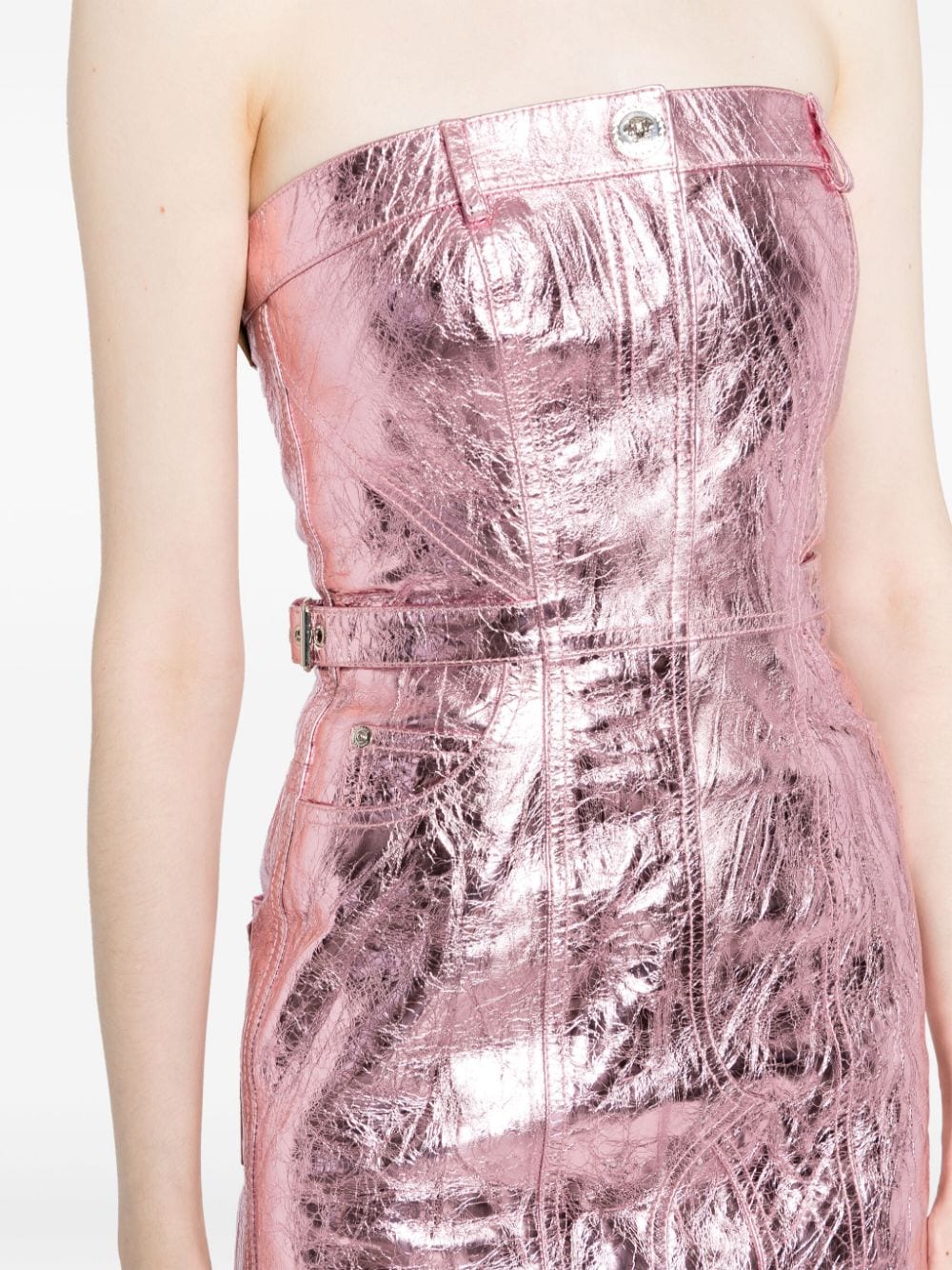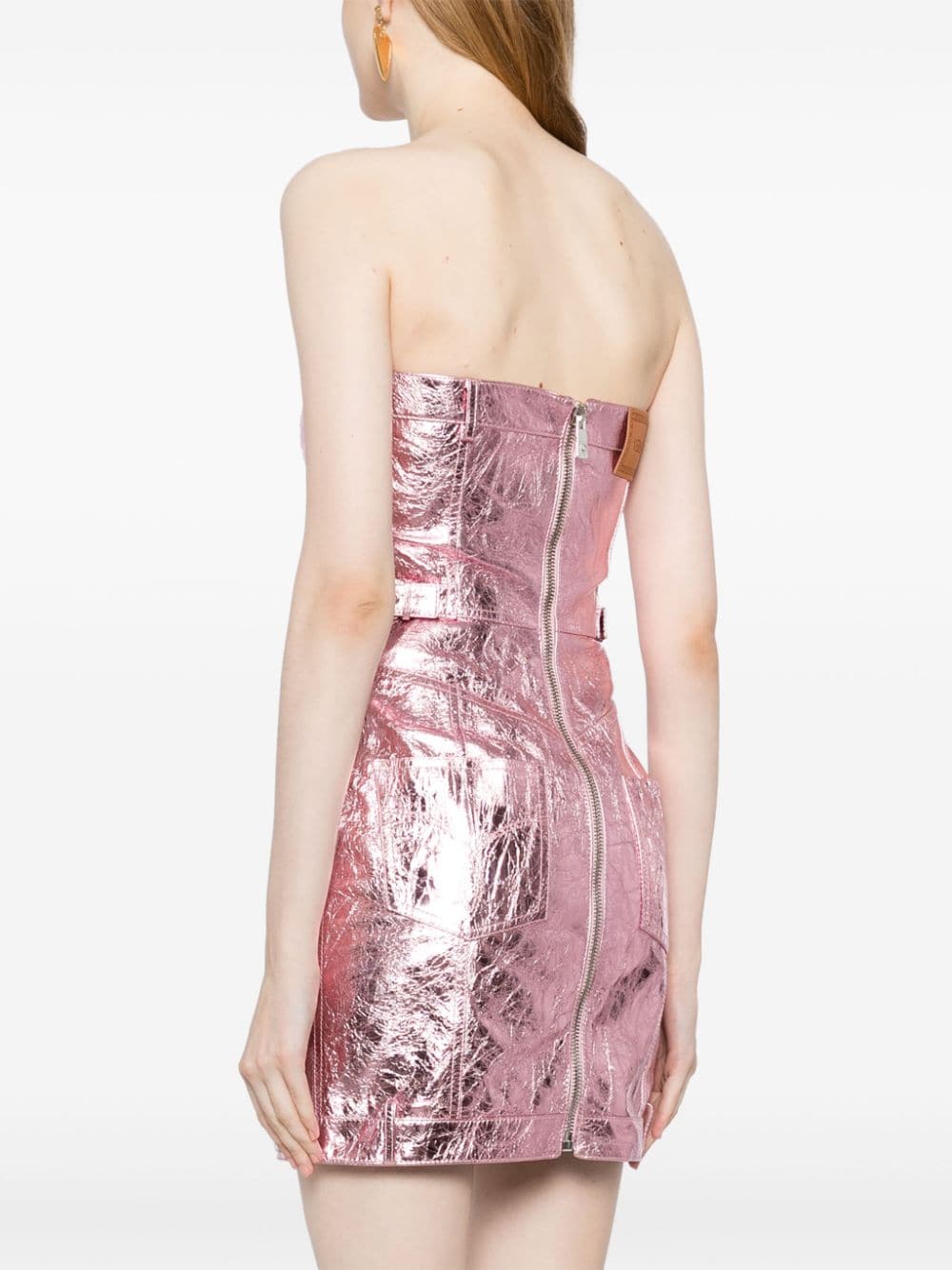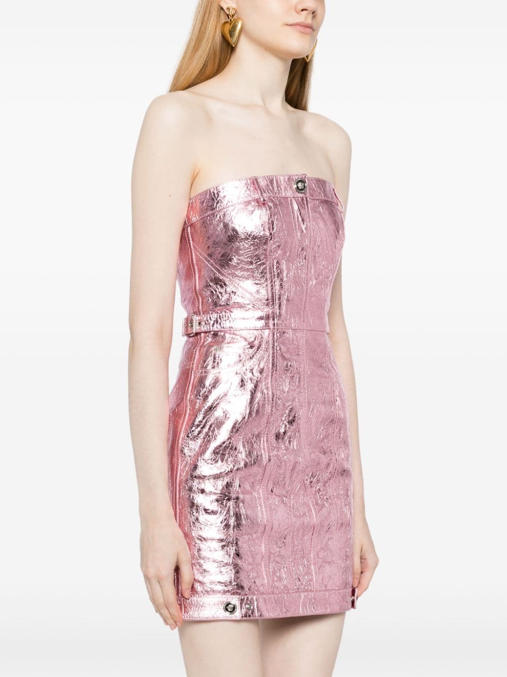 Born between a collaboration between Versace and Dua Lips, this minidress borrows design details associated with jeans. The pink crinkled metallic leather design features a waistband-inspired neckline – complete with a Medusa Head button – arcuate pockets and a leather logo patch at the back.