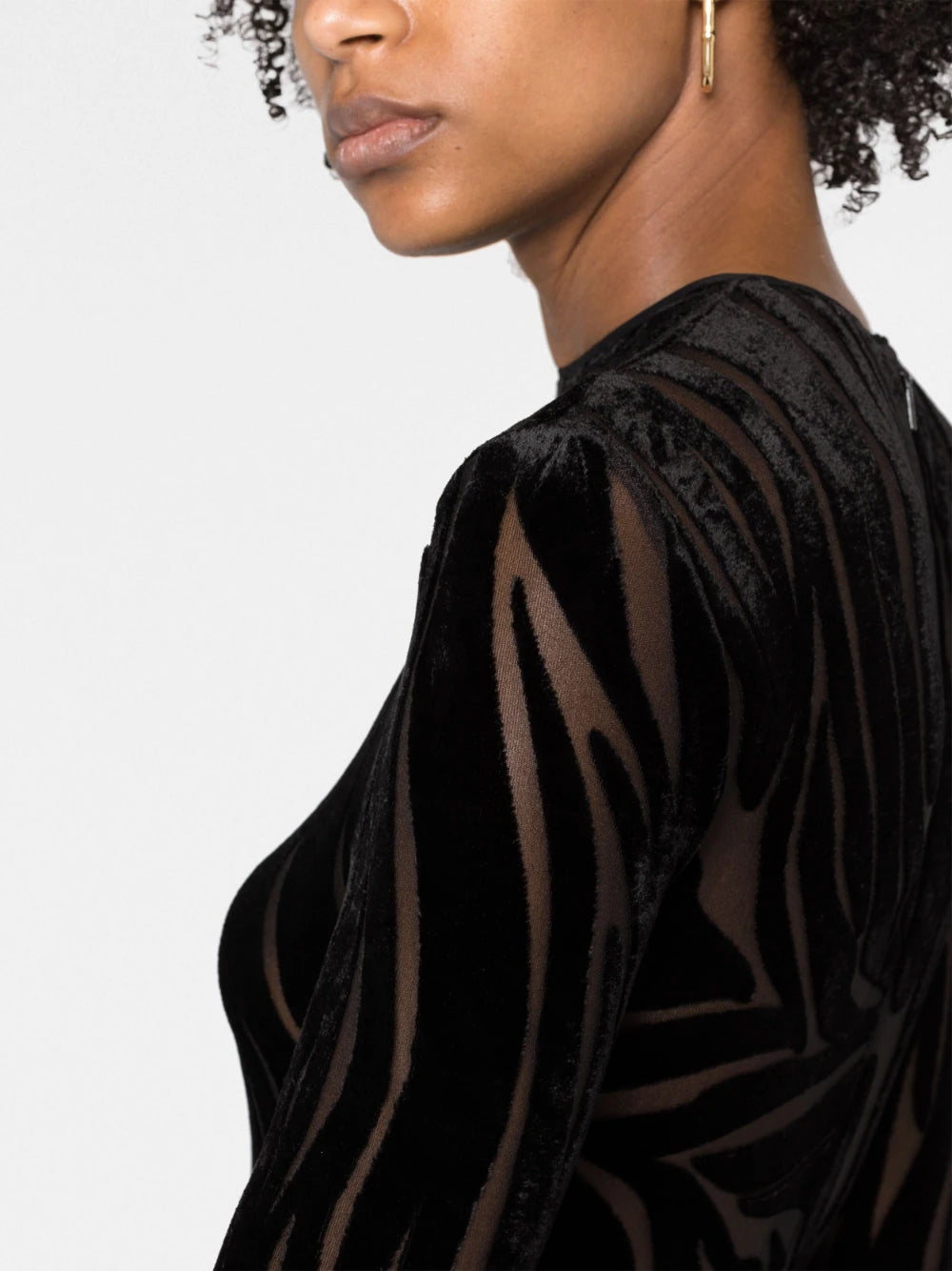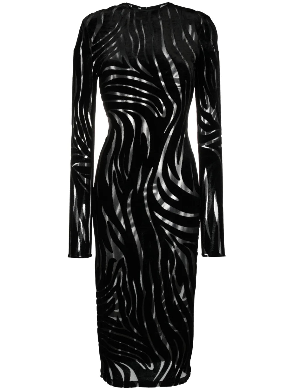 Versace's bold approach to design is showcased in this midi dress from the SS23 collection. The slim-fitting silhouette features a velvety zebra pattern with a see-through effect for a flash of skin.