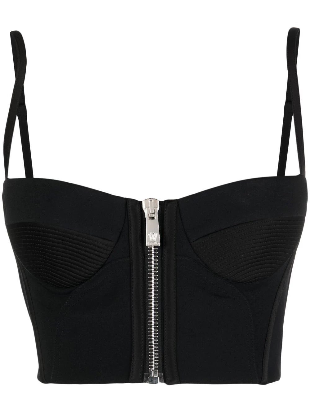 Versace's take on the bustier top features a silver-tone zip through the front. It's crafted with slim shoulder straps and structured, topstitched cups.
