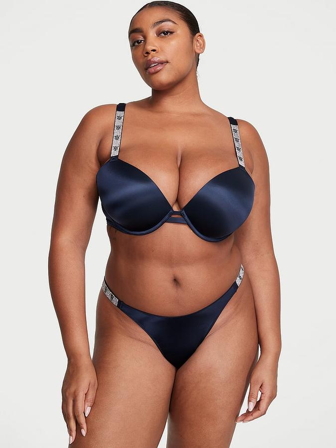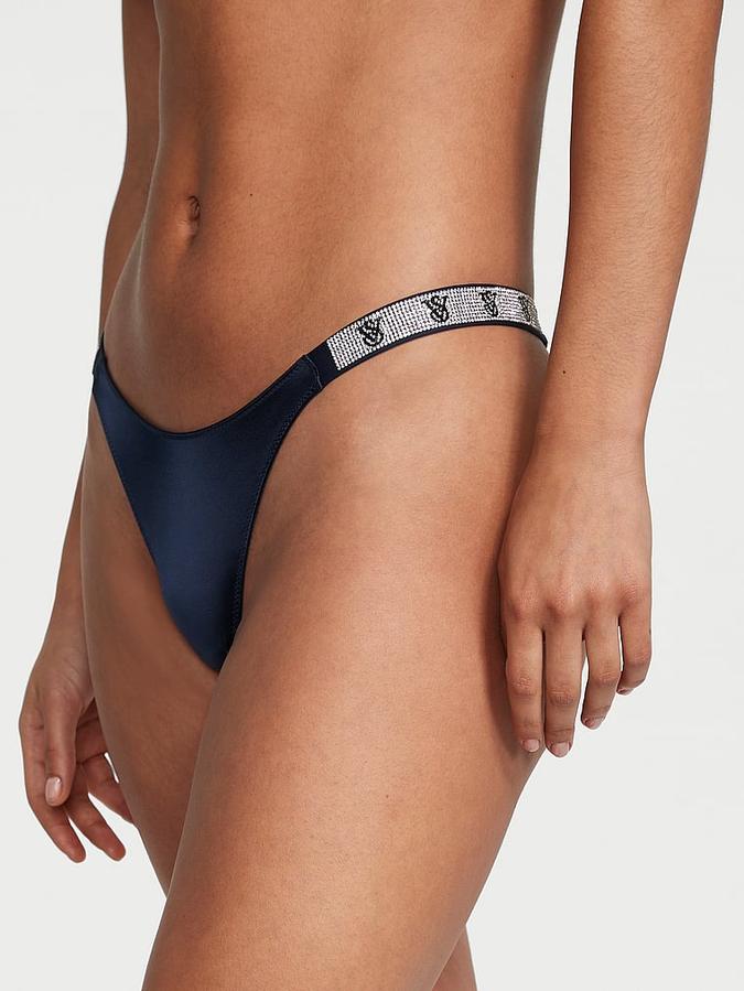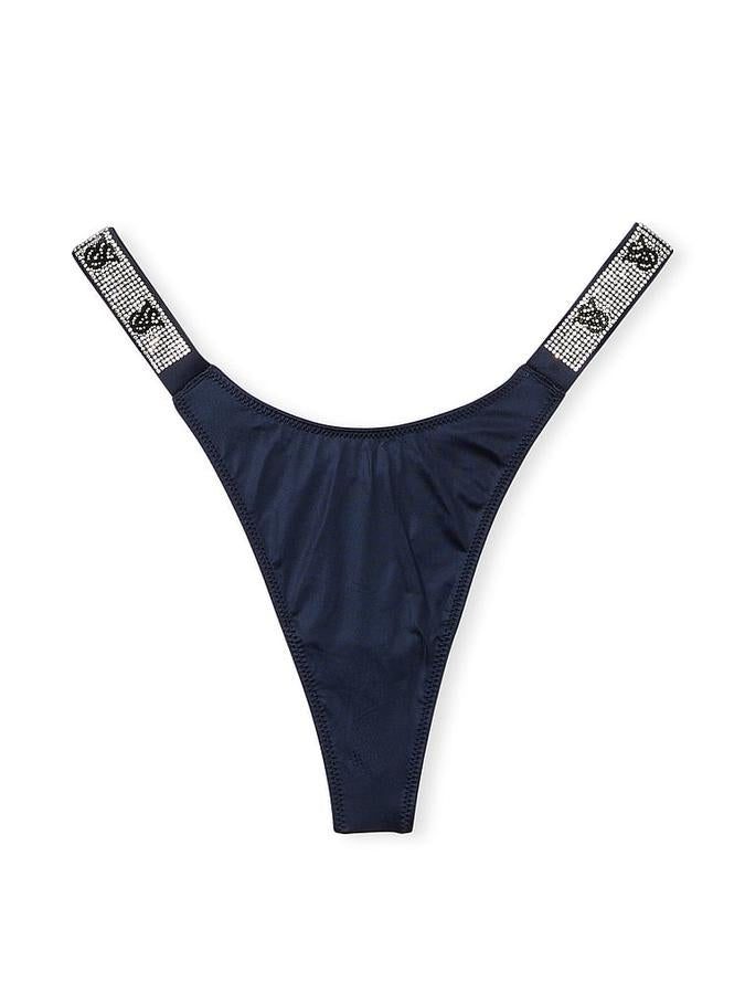 A barely-there thong that dazzles with new shine straps autographed with our script logo in crystals.