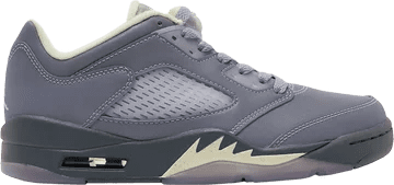 • The Women’s Air Jordan 5 Retro Low ‘Indigo Haze’ showcases a reflective upper in a pale violet hue. The low-top is equipped with customary AJ5 details, including molded eyelets, lace locks and translucent quarter-panel netting. A cream-colored Jumpman is embroidered on the silver reflective tongue, matching the plush textile that lines the low-cut collar. The sneaker is mounted on a Flint Grey polyurethane midsole, featuring visible Air-sole cushioning and signature shark-tooth detailing. Underfoot, a translucent rubber outsole provides durable traction.