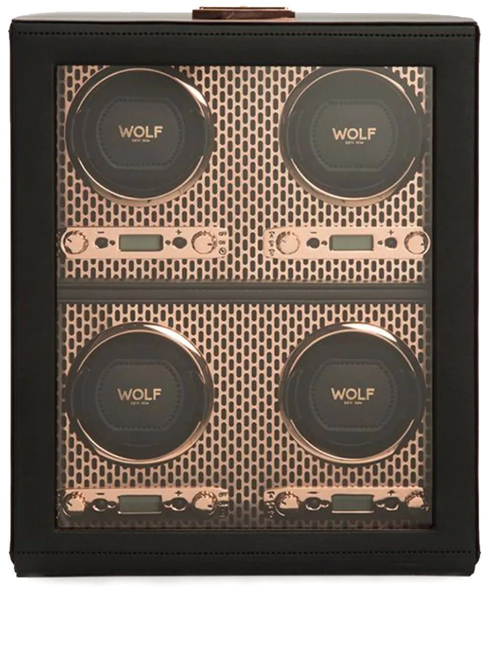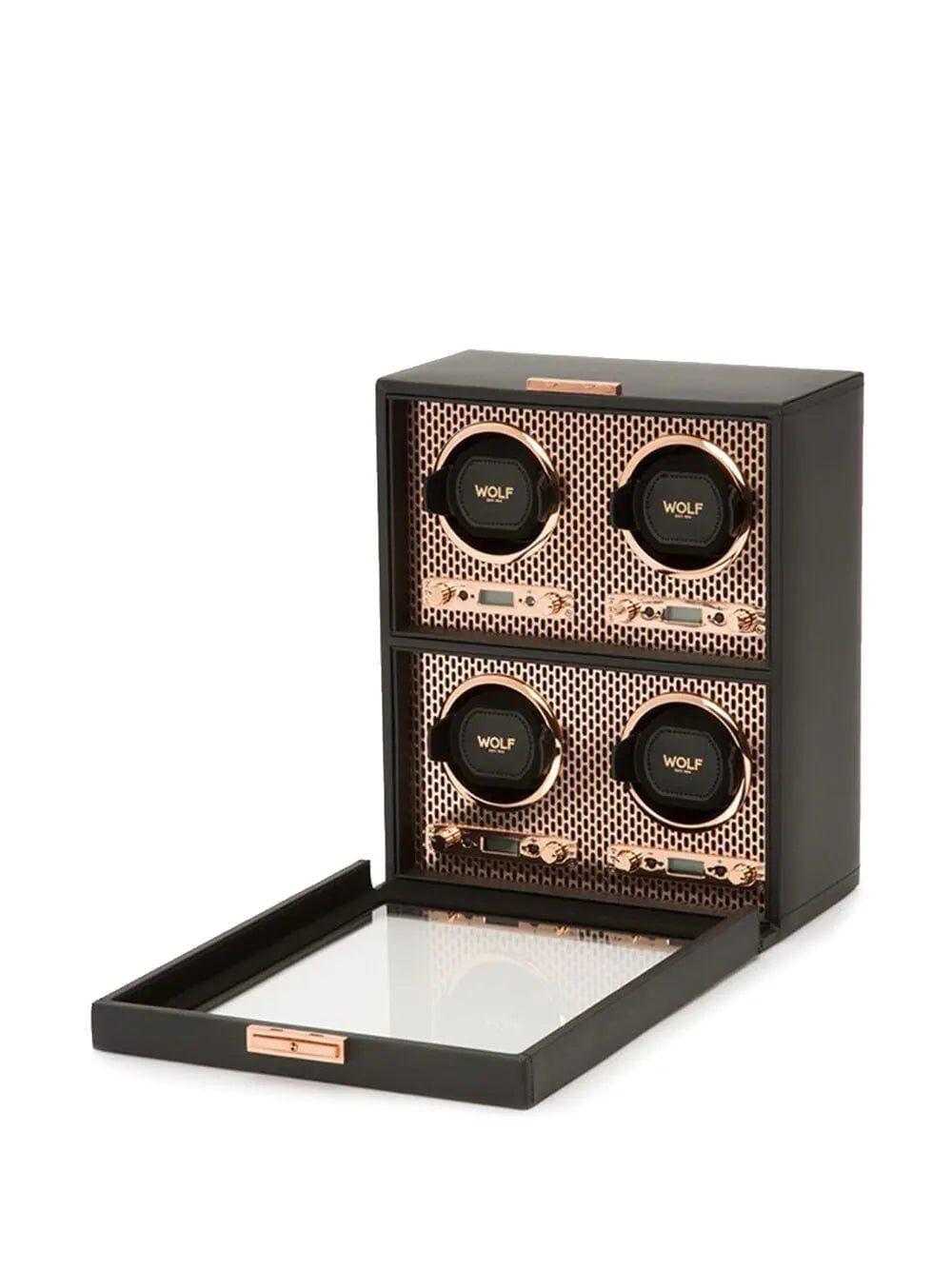 Crafted from black-hued artificial leather, the Axis watch winder demonstrates WOLF's expertise. Offering four slots for storage, this smart design features the brand's patented technology that counts the rotations of the timepiece.