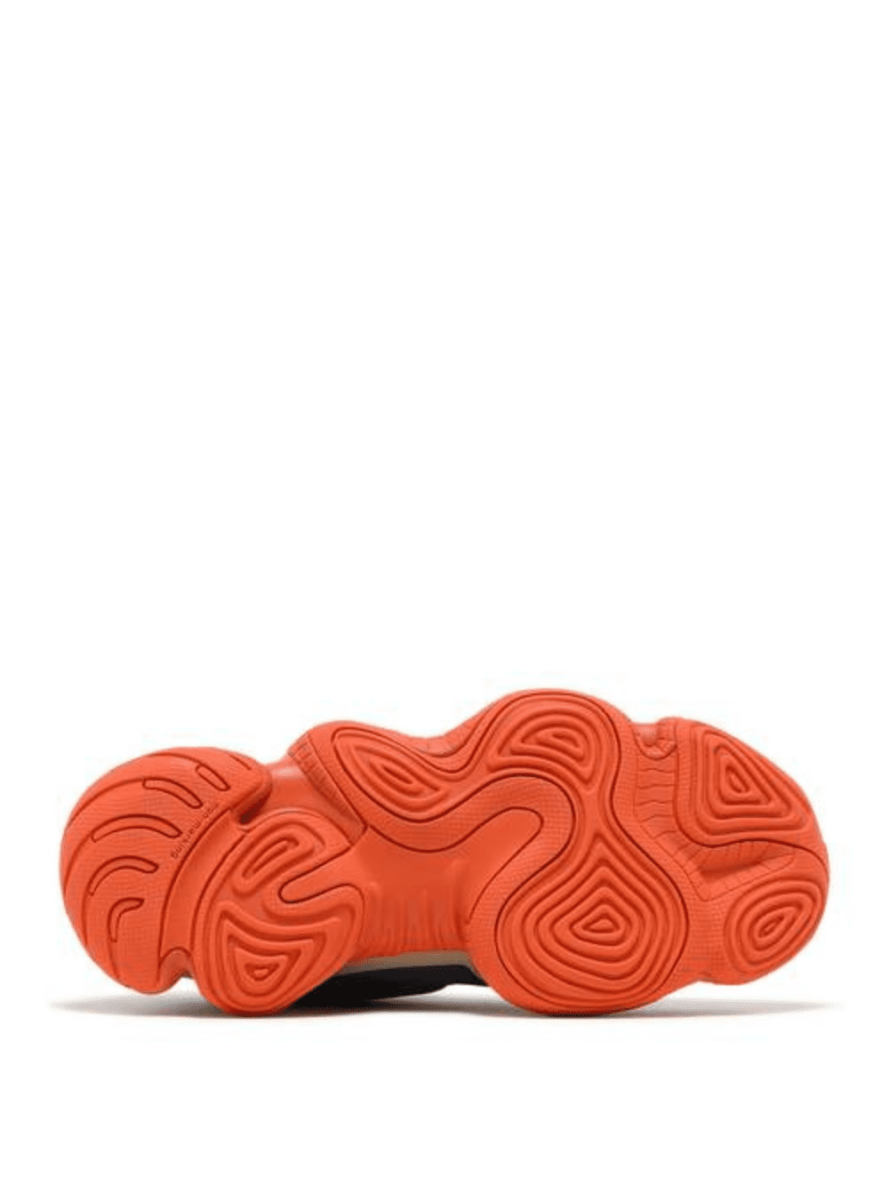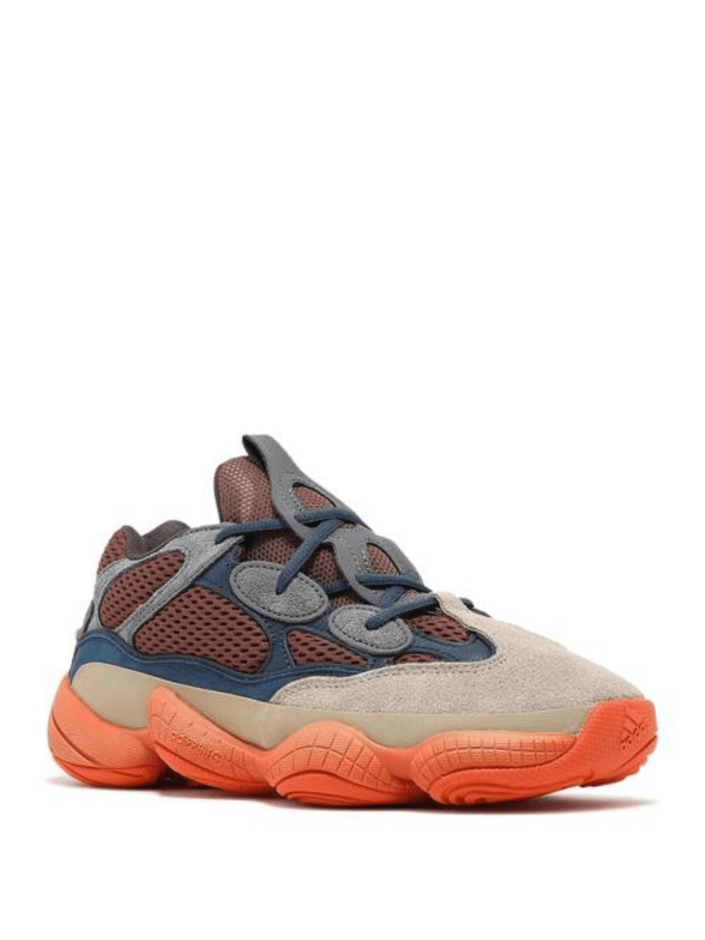 The Yeezy 500 'Enflame' features vibrant tooling on its signature construction. The shoe's upper is built with a mix of open mesh and suede, finished in brown, tan, grey and indigo. A tongue pull-loop is included for easy on and off, while a rubber midfoot wrap bolsters the design. Underfoot, an Adiprene+ midsole provides cushioning and highlights the design in orange, matched underfoot by the rubber outsole, which offers traction.