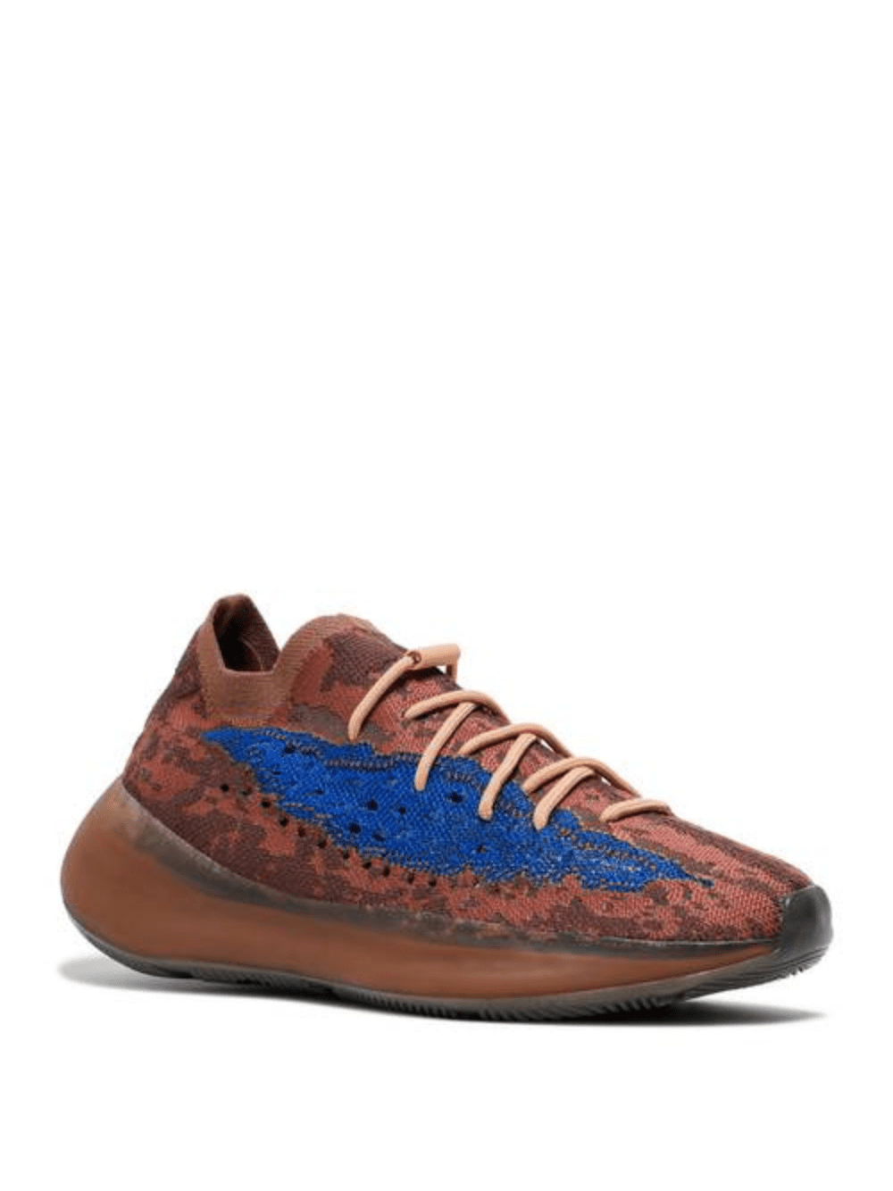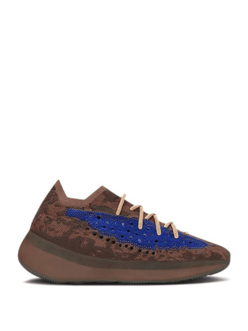 - The Yeezy Boost 380 'Azure' emerges with a neutral look and a vibrant accent. Built with Primeknit, the upper appears in brown, highlighted by blue on the signature monofilament window. The sock-like upper is supported underfoot by a full-length Boost midsole with an elevated heel, while the outsole incorporates a herringbone pattern for traction.