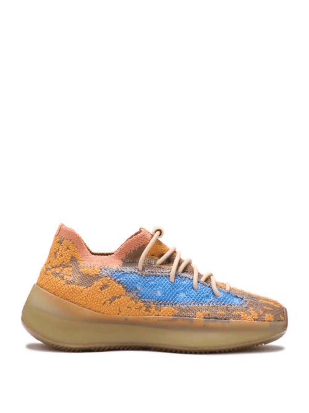 The Yeezy Boost 380 Infant 'Blue Oat Non-Reflective' is an infants' iteration of the shoe. The shoe's knit upper sports a mix orange and brown in a camo-style pattern, with blue on the monofilament window highlighting the look. Underfoot, the midsole incorporates a semitranslucent rubber cage that encases a full-length Boost midsole.