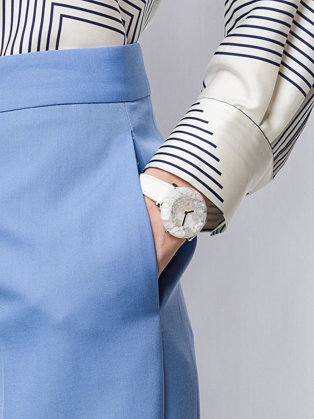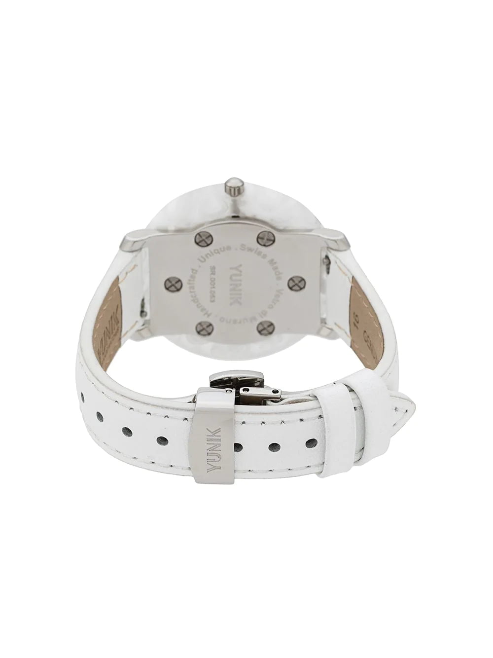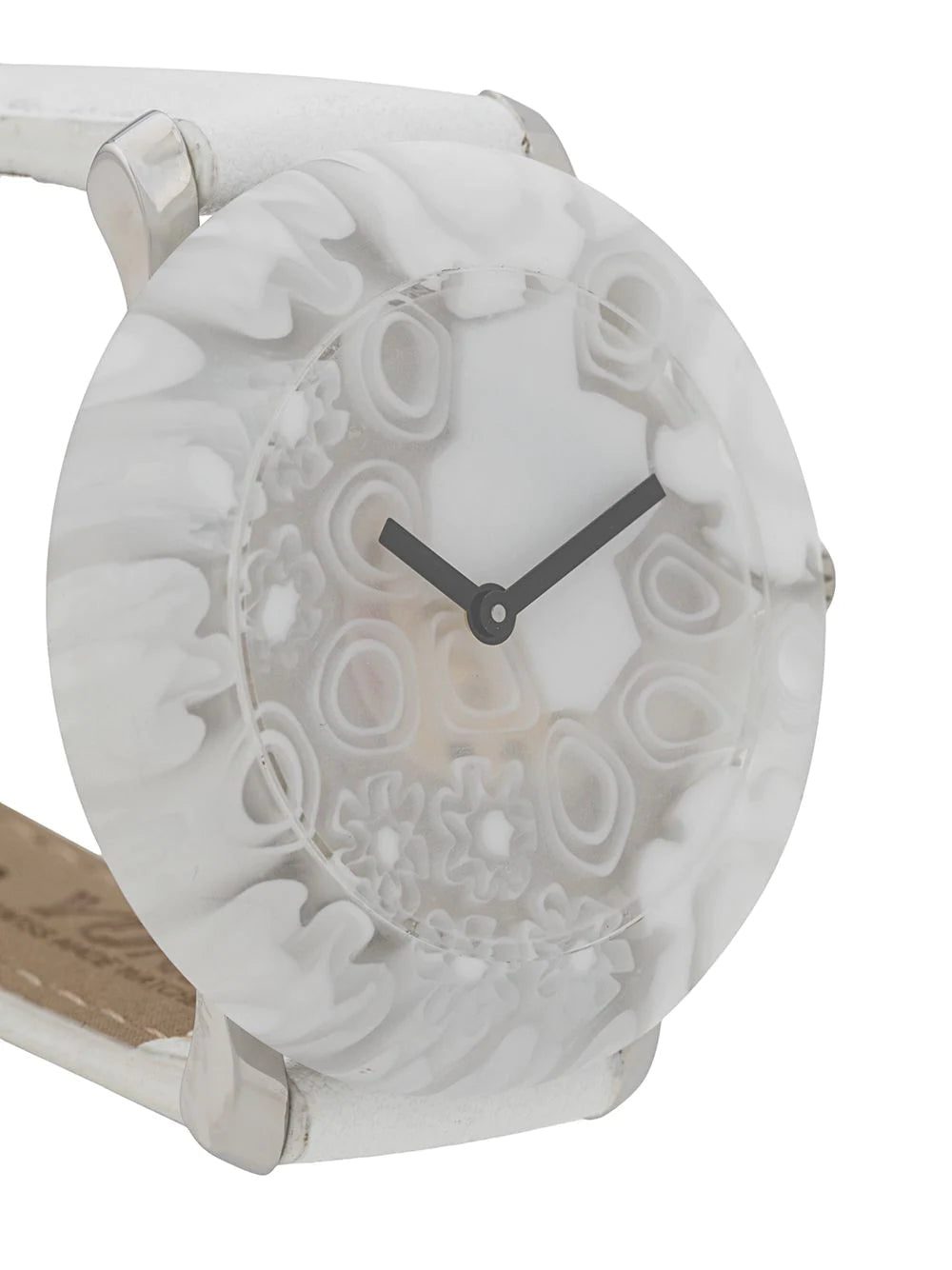 YUNIK embraces a modern ethos by reviving the legacy of Murano glass, while keeping each piece unique (as the name itself indicates). The Swiss brand transforms time-keeping into an artistic expression with geometric shapes and vivid colours inspired by the reflection of the light on the tiles in St Mark’s Square, Venice. Entirely made from one piece of Murano glass, this exquisite Small Round White Flowers watch has been crafted by hand, and then machined into a circular shape using a diamond-grinding technique. It features an anti-allergic steel case back, a RONDA Quartz movement, a splash-proof design and an Italian-made white leather strap. Please note, each watch is handmade using one piece of Murano glass and therefore may differ slightly from the images shown here.