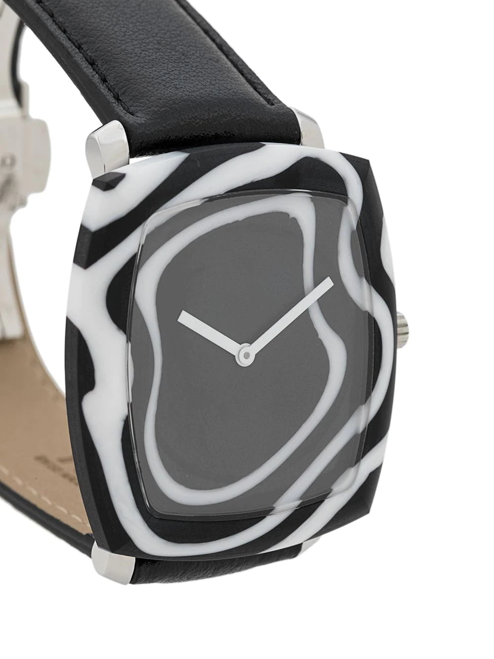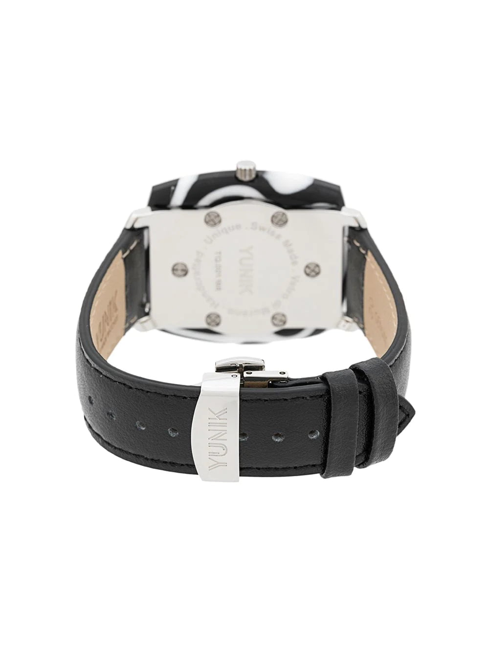 YUNIK embraces a modern ethos by reviving the legacy of Murano glass, while keeping each piece unique (as the name itself indicates). The Swiss brand transforms time-keeping into an artistic expression with geometric shapes and vivid colours inspired by the reflection of the light on the tiles in St Mark’s Square, Venice. Entirely made from one piece of Murano glass, this exquisite Zebra watch has been crafted by hand, and then machined into a tonneau shape using a diamond-grinding technique. It features an anti-allergic steel case back, a RONDA Quartz movement, a splash-proof design and an Italian-made black leather strap. Please note, each watch is handmade using one piece of Murano glass and therefore may differ slightly from the images shown here.